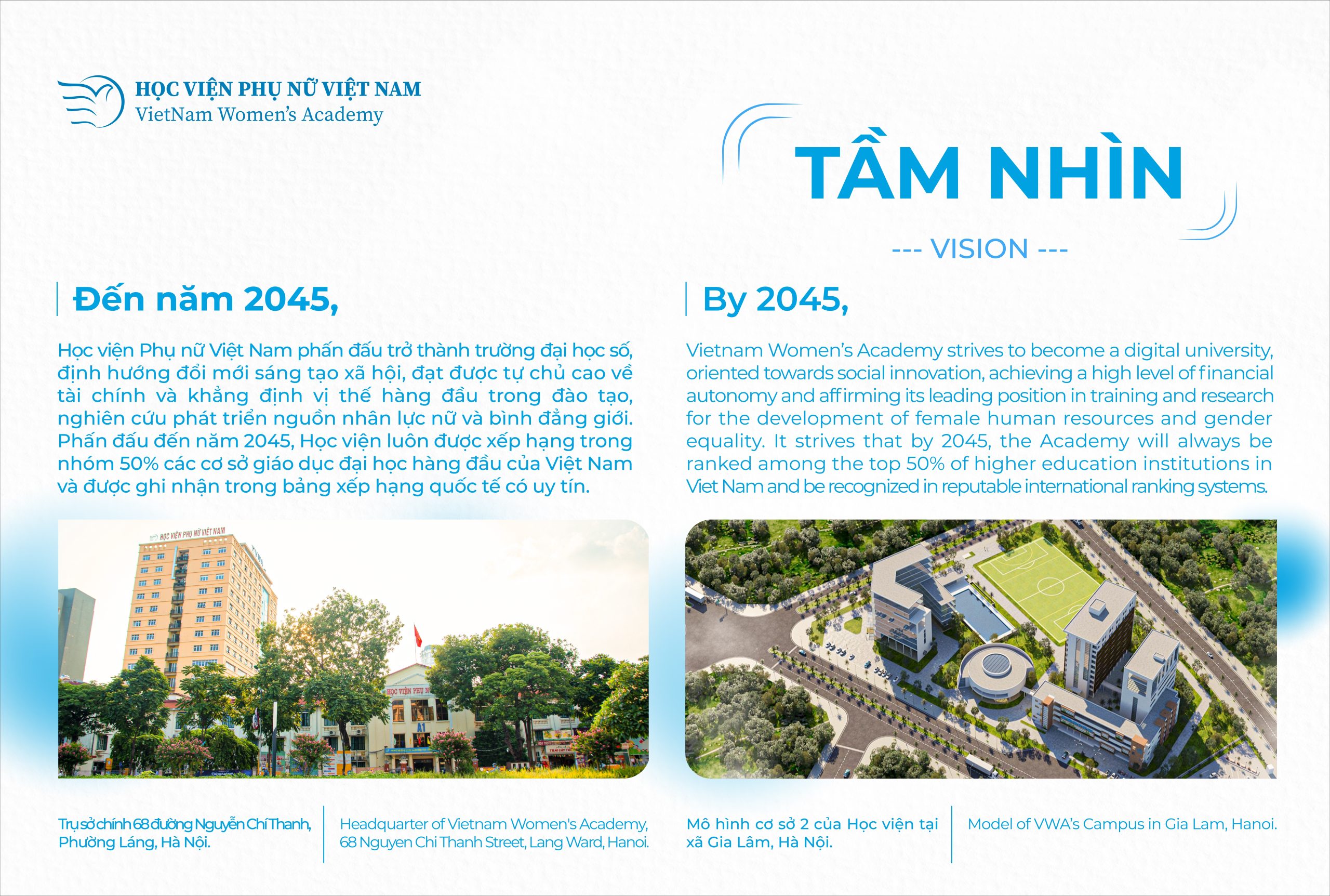 Học viện Phụ nữ Việt Nam phấn đấu trở thành trường đại học số, định hướng đổi mới sáng tạo xã hội, đạt được tự chủ cao về tài chính và khẳng định vị thế hàng đầu trong đào tạo, nghiên cứu phát triển nguồn nhân lực nữ và bình đẳng giới. Phấn đấu đến năm 2045, Học viện luôn được xếp hạng trong nhóm 50% các cơ sở giáo dục đại học hàng đầu của Việt Nam và được ghi nhận trong bảng xếp hạng quốc tế có uy tín.
