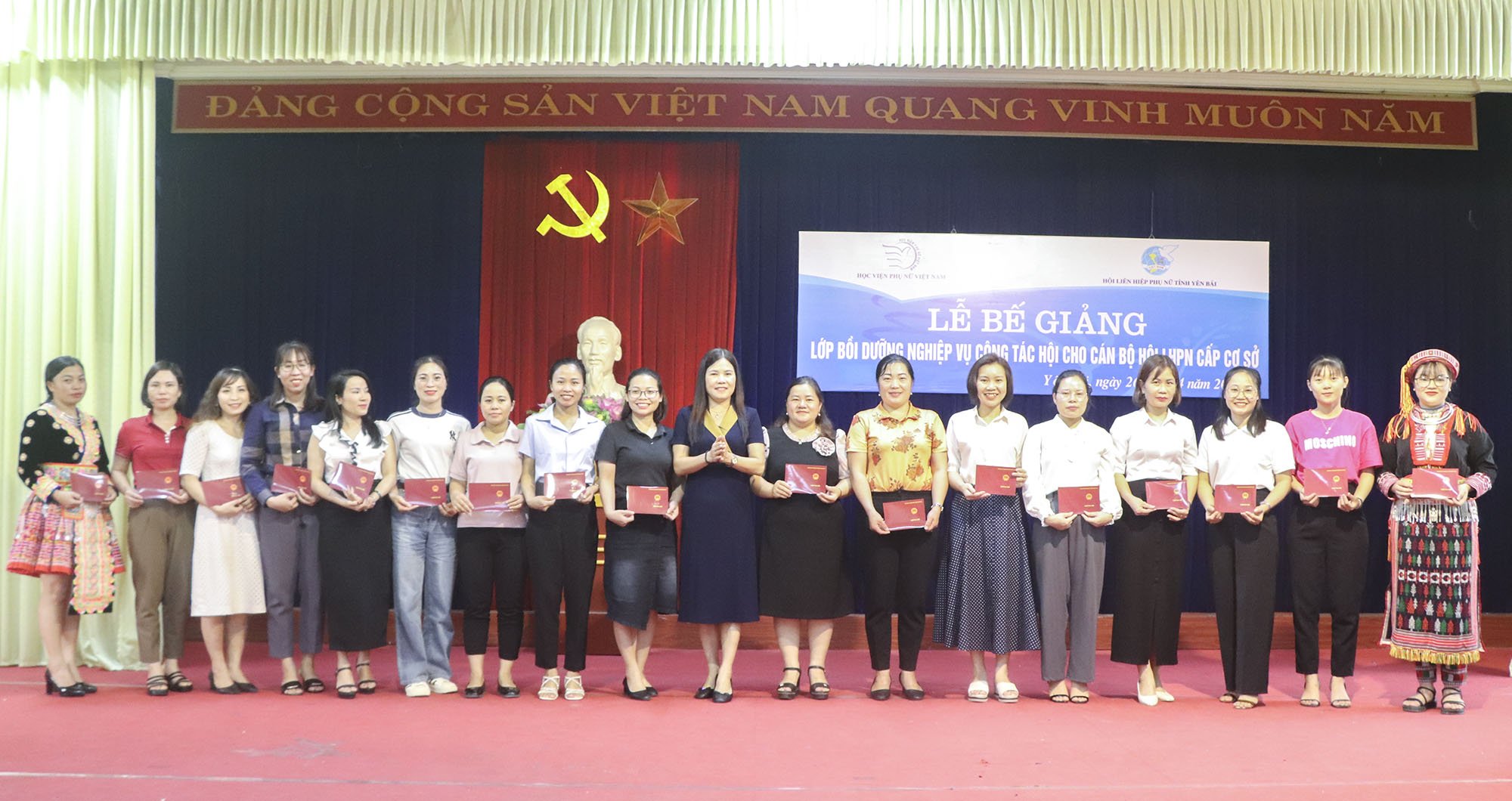 Tham dự lễ bế giảng có PGS.TS.Trần Quang Tiến – Giám đốc Học viện Phụ nữ Việt Nam, đồng chí Nguyễn Thị Bích Nhiệm – Chủ tịch Hội LHPN tỉnh Yên Bái, đại diện Trung tâm Bồi dưỡng cán bộ của Học viện, đại diện các đơn vị trực thuộc Hội LHPN tỉnh Yên Bái và 50 học viện của lớp.