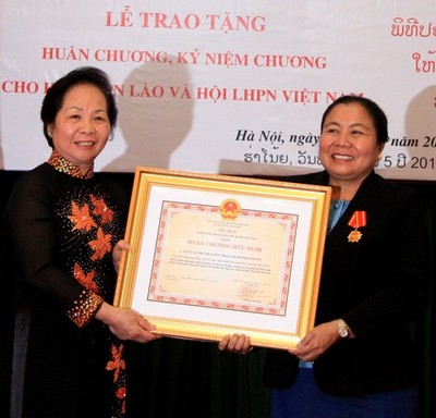 Phát biểu tại buổi Lễ, Chủ tịch Hội LHPN Việt Nam Nguyễn Thị Thanh Hòa khẳng định, trong 50 năm qua, cùng với Đảng, Nhà nước, nhân dân Việt Nam và nhân dân các bộ tộc Lào, Hội LHPN Việt Nam và Hội LHPN Lào cũng như phụ nữ hai nước đã nỗ lực xây dựng, vun đắp mối tình hữu nghị, đoàn kết đặc biệt giữa hai nước Việt- Lào; đặc biệt, từ sau những năm 80, mối quan hệ giữa hai Hội ngày càng được củng cố và nâng lên tầm cao mới thông qua việc ký kết các thỏa thuận hợp tác. Chủ tịch Hội cũng đánh giá cao và coi việc trao tặng Huân chương và Kỷ niệm chương là sự bày tỏ tình cảm trân trọng, lòng biết ơn đối với tình cảm son sắt, thủy chung của nhân dân và phụ nữ Lào đã dành cho nhân dân và phụ nữ Việt Nam trong kháng chiến cứu nước cũng như thời kỳ đổi mới. Bày tỏ sự xúc động, vui mừng khi được nhận Huân chương Hữu nghị của Nhà nước Việt Nam trao tặng, đ/c Si- sảy Lư- dệt- mun- sỏn coi đó là phần thưởng cao quý, sự ghi nhận của Nhà nước Việt Nam đối với phụ nữ Lào về những thành tích đã đạt được trong việc góp phần vun đắp mối quan hệ hữu nghị, tình đoàn kết đặc biệt, sự hợp tác toàn diện giữa hai Đảng, Nhà nước, nhân dân, hai Hội LHPN và phụ nữ hai nước Việt – Lào. Đ/c Si- sảy Lư- dệt- mun- sỏn đánh giá cao và trân trọng ghi nhận sự giúp đỡ to lớn cả về vật chất lẫn tinh thần của Hội LHPN Việt Nam đối với Hội LHPN Lào trong giai đoạn qua; khẳng định tình đoàn kết giữa phụ nữ Việt- Lào mãi là tình cảm chị em một nhà, không gì thay đổi được; đồng thời hứa sẽ làm hết sức mình để góp phần gìn giữ, vun đắp và phát triển tình đoàn kết hữu nghị thủy chung son sắt đó. |