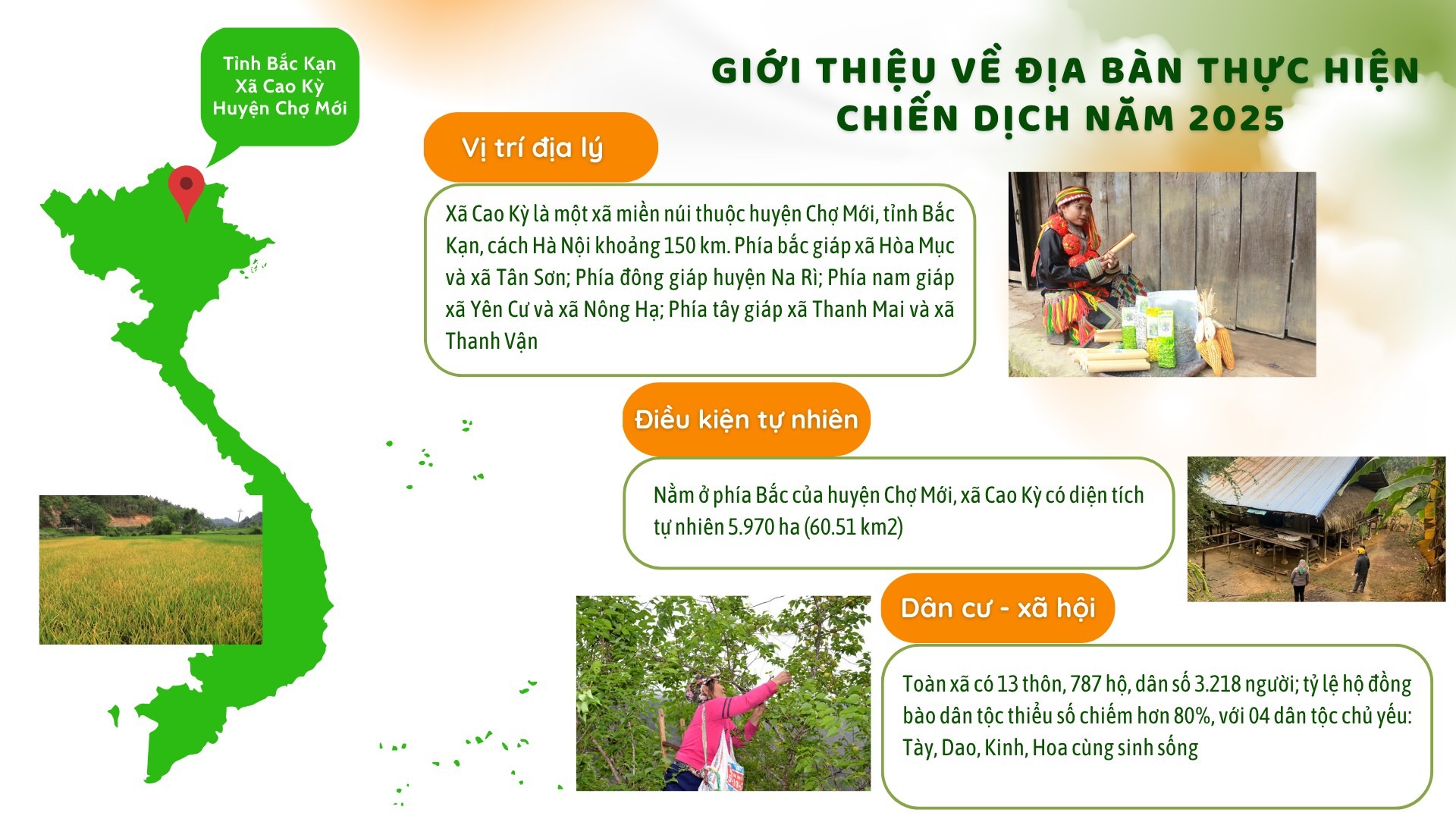 Năm nay, điểm đến của chiến dịch là xã Cao Kỳ, huyện Chợ Mới, tỉnh Bắc Kạn – một địa phương còn nhiều khó khăn về cơ sở vật chất, điều kiện sinh hoạt và các dịch vụ xã hội. Chiến dịch dự kiến diễn ra từ ngày 18/7/2025 đến ngày 21/7/2025, với sự tham gia của các đoàn viên, sinh viên đang học tập tại Học viện Phụ nữ Việt Nam.