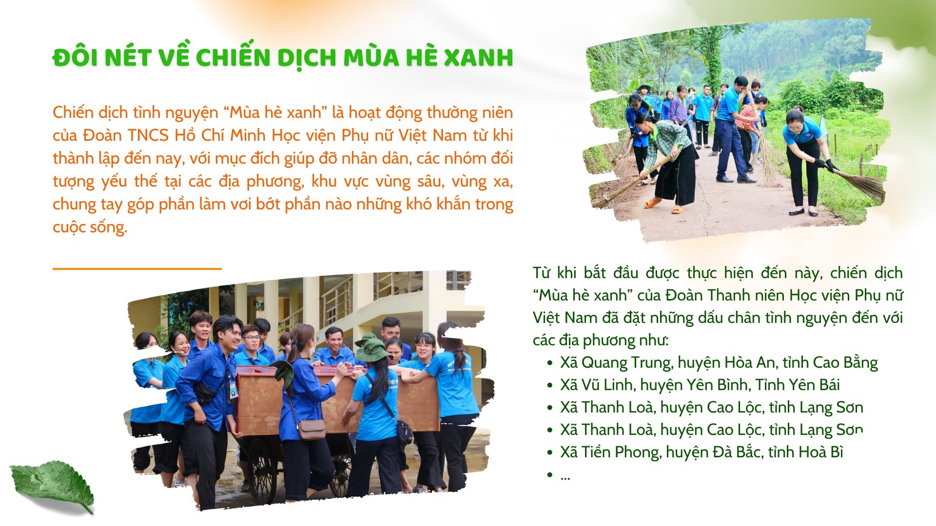 Không chỉ đơn thuần là chuyến đi thiện nguyện, “Mùa Hè Xanh” là dịp để tuổi trẻ Học viện Phụ nữ Việt Nam học hỏi, trưởng thành và hiểu thêm về cuộc sống của những vùng đất còn nhiều thiếu thốn. Từng mái nhà, từng ánh mắt, từng cái nắm tay của người dân là nguồn động lực lớn lao để các bạn trẻ tiếp tục nỗ lực mang lại điều tích cực cho cộng đồng.