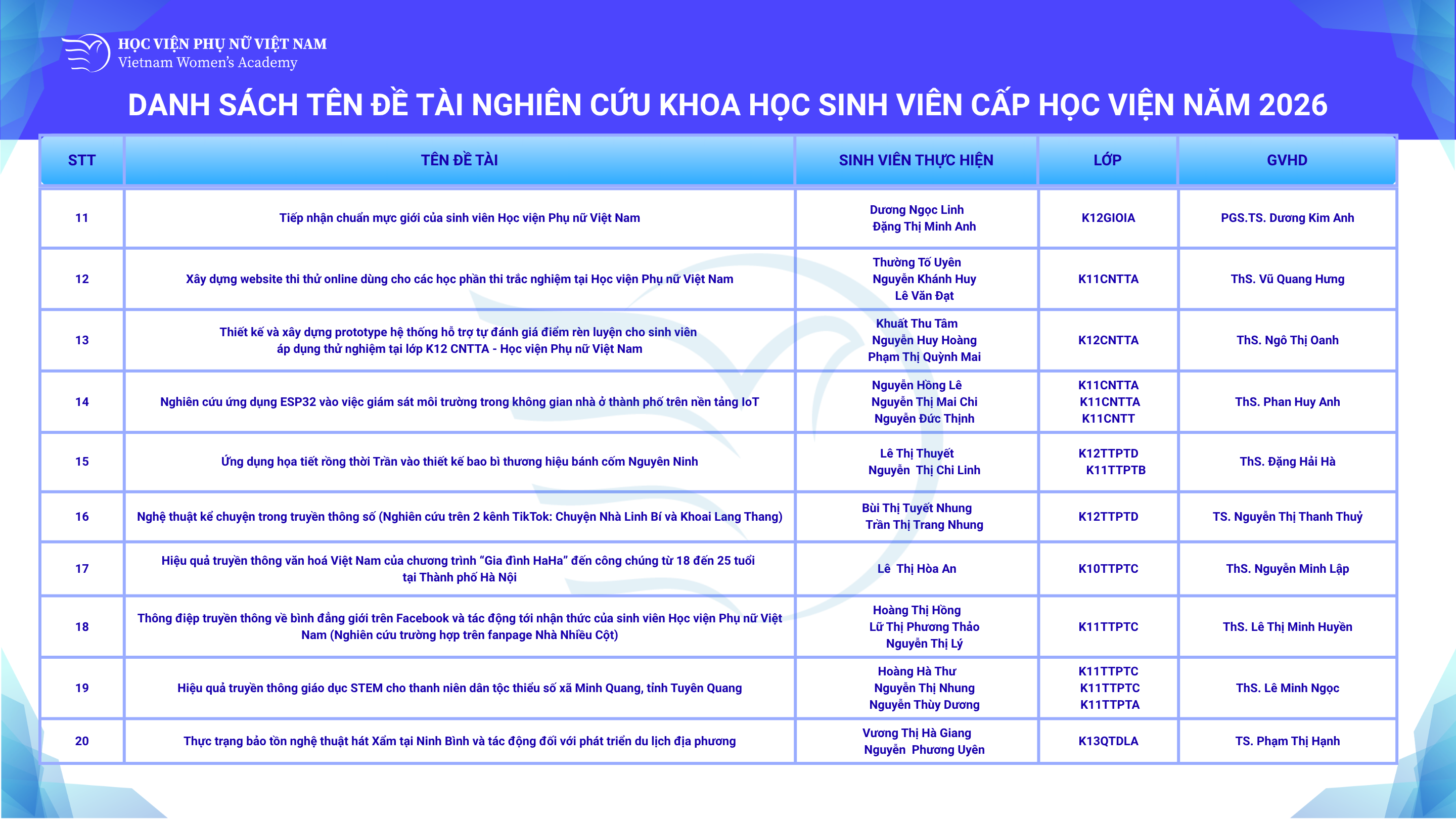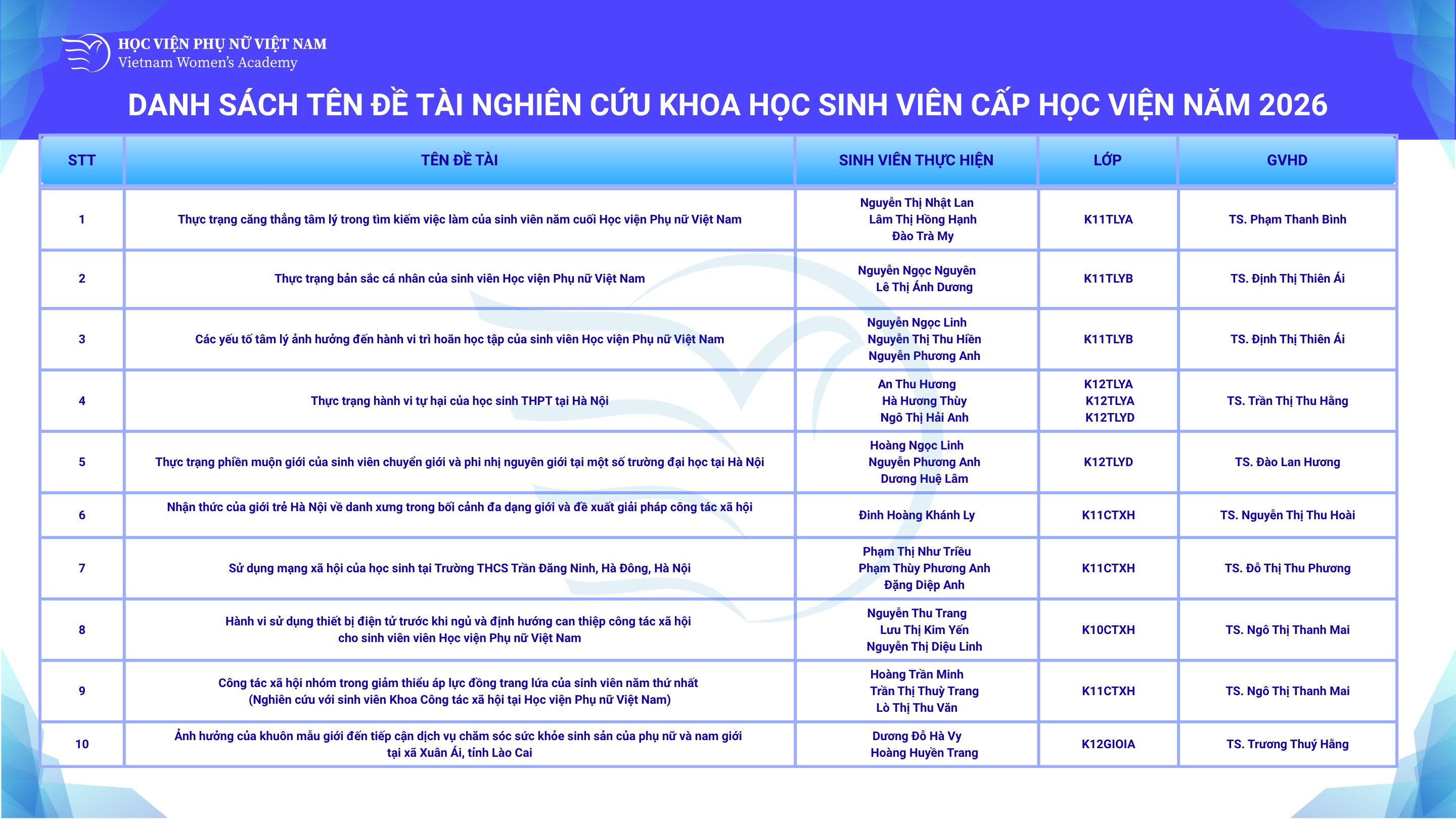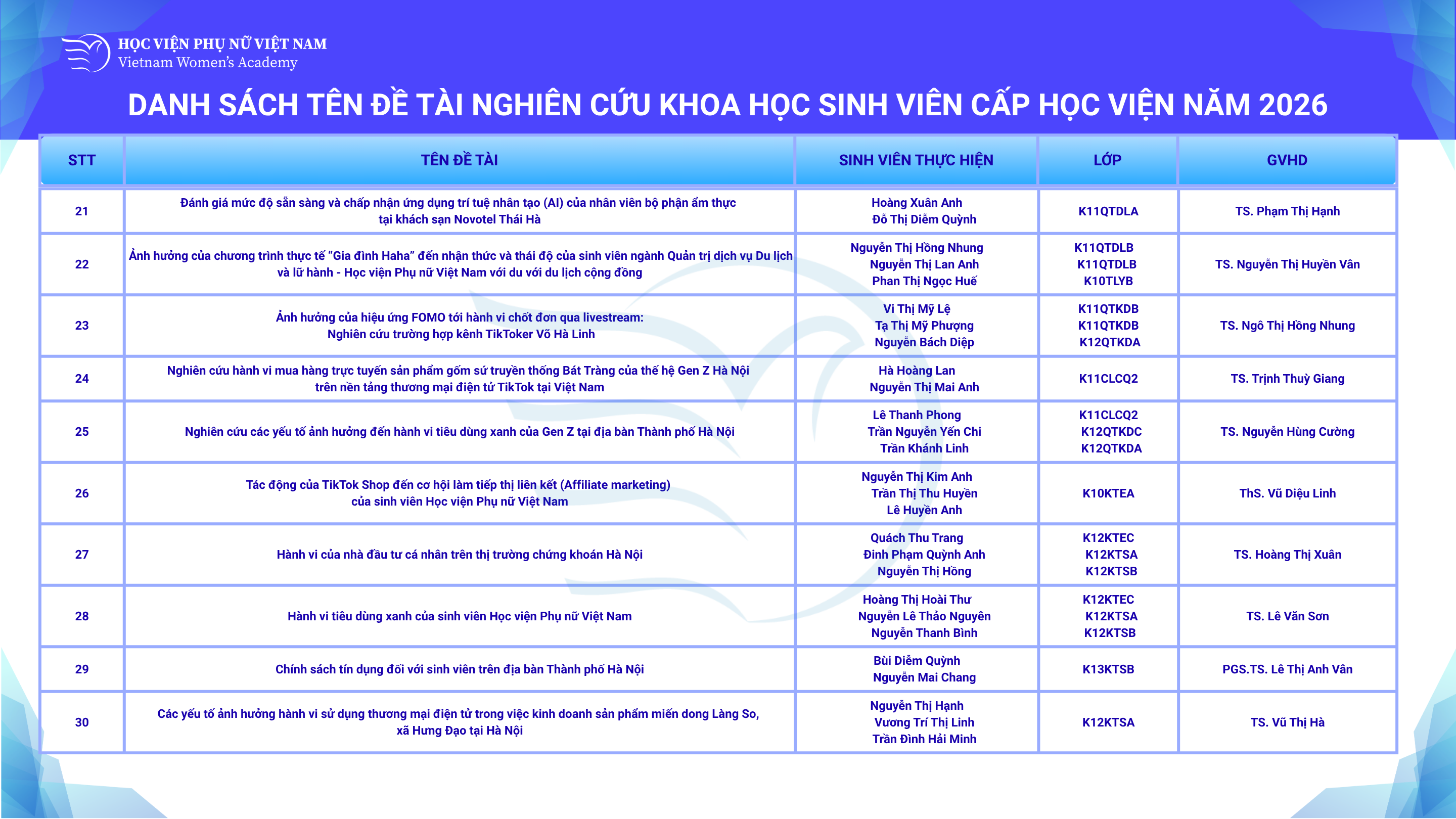 Danh sách các đề tài nghiên cứu khoa học sinh viên cấp Học viện năm nay là minh chứng cho sự trưởng thành trong tư duy nghiên cứu của sinh viên, đồng thời phản ánh môi trường học thuật ngày càng được chú trọng và phát triển tại Học viện.