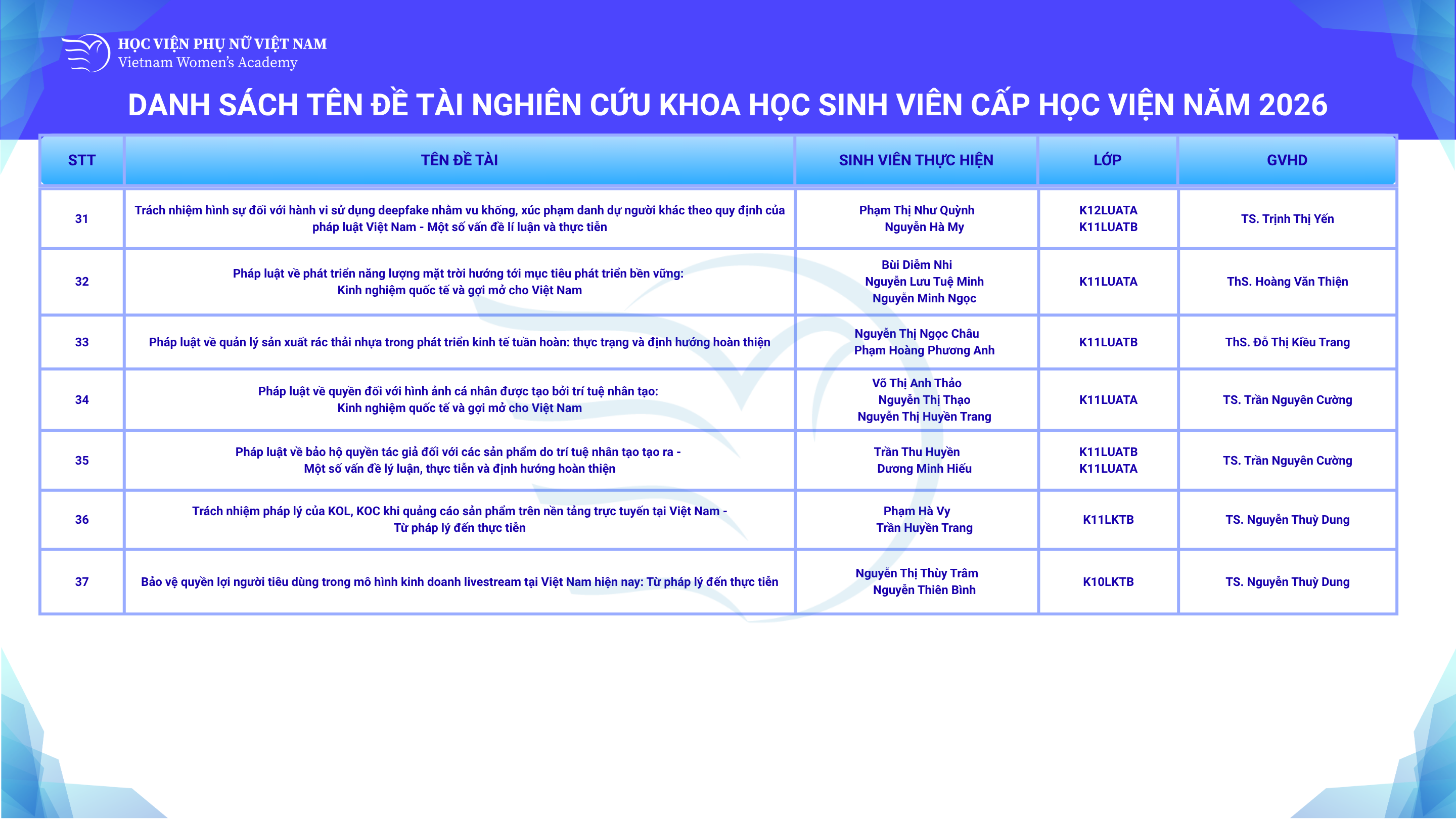 Có thể khẳng định, hoạt động nghiên cứu khoa học sinh viên cấp Học viện đang góp phần quan trọng vào việc nâng cao chất lượng đào tạo tại Học viện Phụ nữ Việt Nam. Từ những đề tài được triển khai, sinh viên không chỉ phát triển năng lực học thuật mà còn hình thành tư duy độc lập, sáng tạo và khả năng thích ứng với môi trường làm việc trong tương lai.