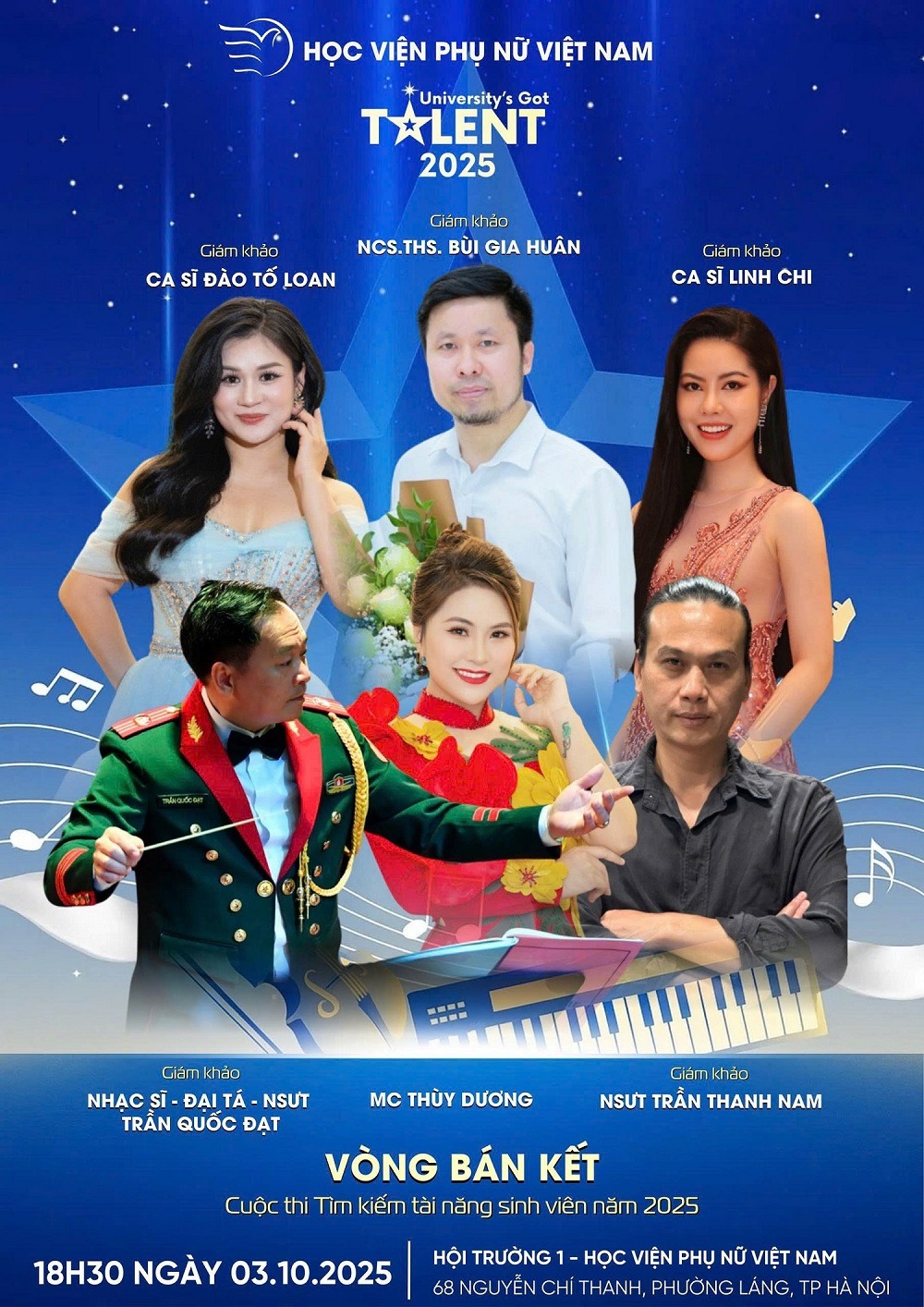 ✨ Với sự góp mặt của hội đồng giám khảo uy tín, công bằng và đầy nhiệt huyết, đêm Bán kết University’s Got Talent 2025 không chỉ là nơi để Top 30 tài năng trẻ tiếp tục khẳng định bản lĩnh, mà còn là không gian giao thoa giữa nhiều sắc màu nghệ thuật, nơi những ước mơ và khát vọng bùng cháy mãnh liệt.
