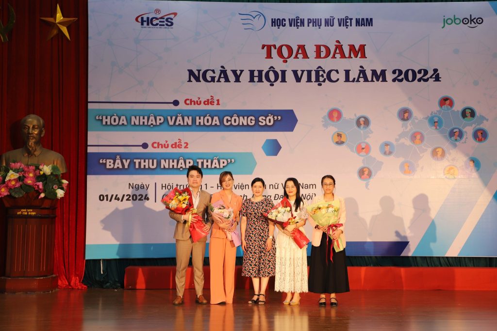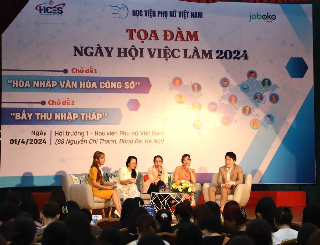 Buổi tọa đàm có sự tham dự của ThS. Hà Thị Thanh Vân – Phó Giám đốc Học viện Phụ nữ Việt Nam, lãnh đạo các đơn vị thuộc Học viện. Các diễn giả tham gia chia sẻ tại tọa đàm là những chuyên gia về nhân sự thuộc các lĩnh vực khác nhau: Chuyên gia Thương Vũ – Giám đốc tại Sconnect Academy of Media Arts; Chuyên gia Minh Trần – Chief Marketing Officer tại The English Coach; Chuyên gia Ngô Thanh Thủy – Trưởng phòng Thu hút nhân tài tại Bảo hiểm Vietinbank (VBI); Chuyên gia Đặng Luyến – Trưởng phòng nhân sự tại Rocket Game Studio.