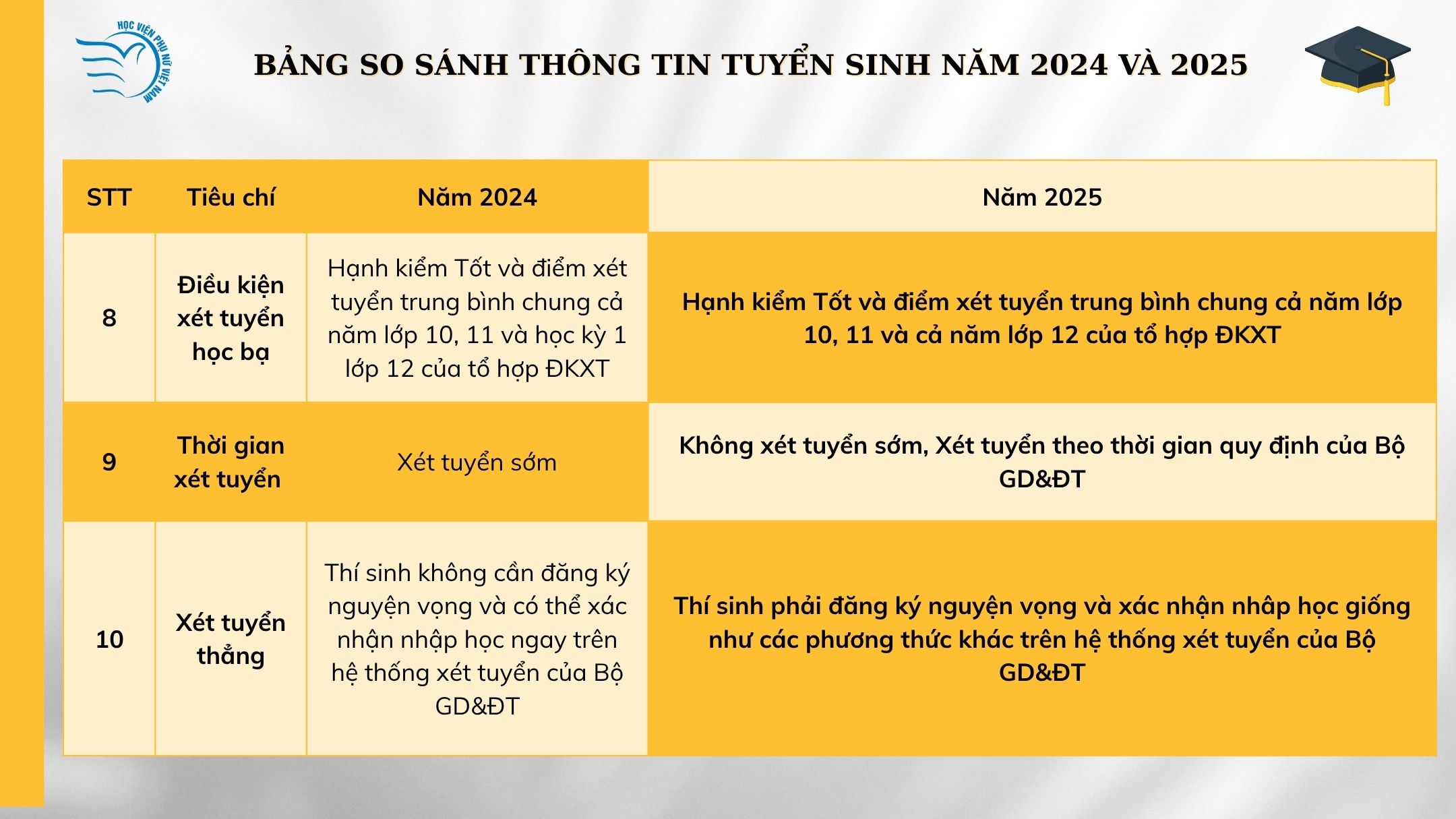 Năm 2025 – hãy để Học viện Phụ nữ Việt Nam là điểm khởi đầu cho hành trình trưởng thành của bạn. Với hệ thống xét tuyển linh hoạt, tổ hợp phong phú, ngành học đa dạng và môi trường học tập thân thiện, Học viện không chỉ giúp bạn “đỗ đại học” mà còn giúp bạn trưởng thành toàn diện về tri thức, kỹ năng và giá trị sống.