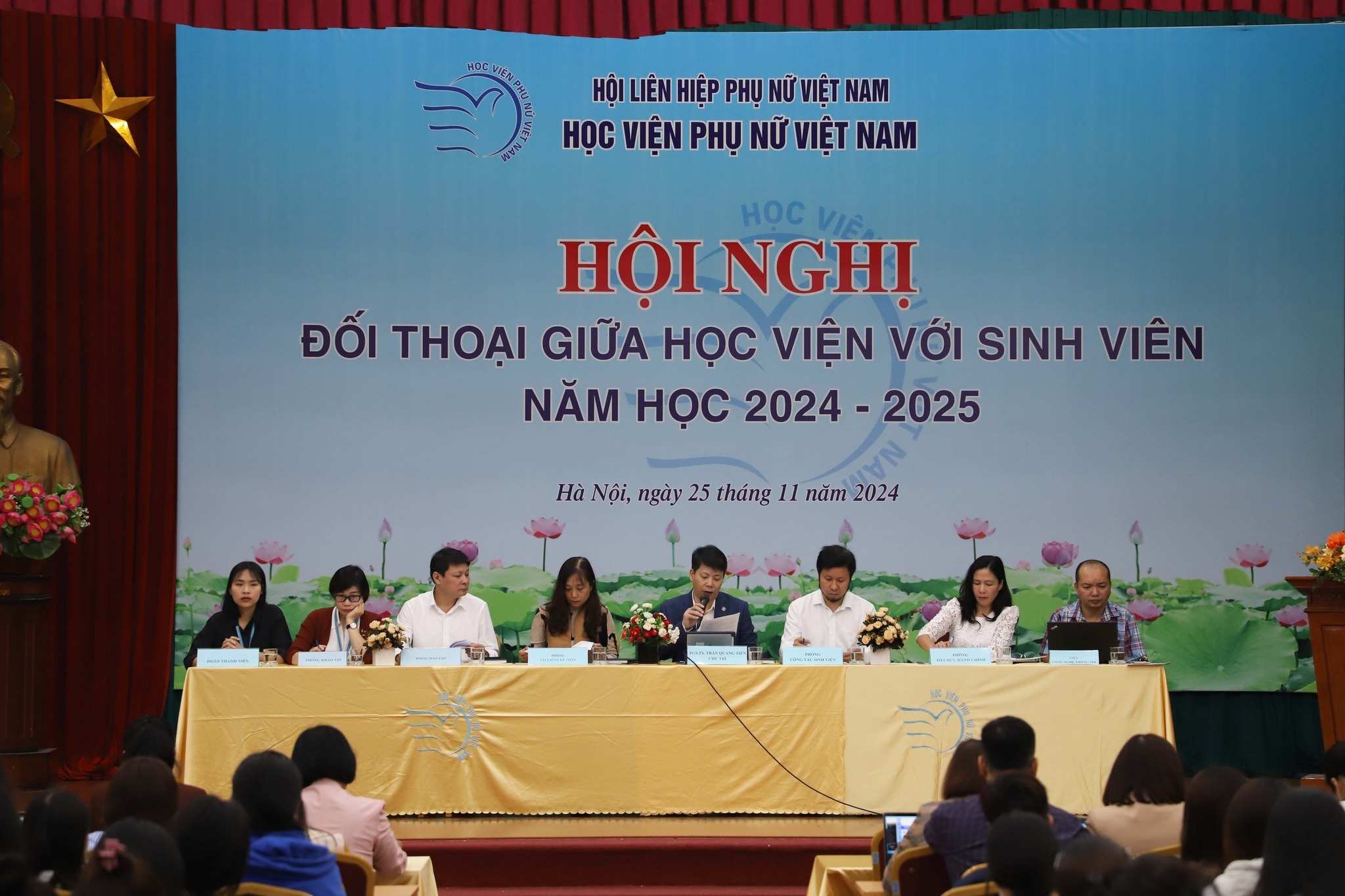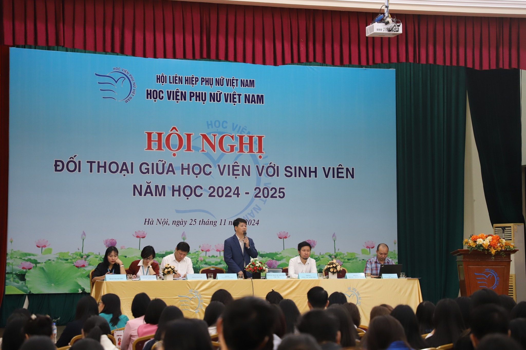 Với phương châm lấy người học làm trung tâm, Hội nghị đối thoại với sinh viên năm học 2024 – 2025 của Học viện Phụ nữ Việt Nam đã tiếp tục phát huy tính chủ động, sáng tạo và tinh thần trách nhiệm của sinh viên. Phát biểu kết luận tại hội nghị, Giám đốc Trần Quang Tiến hoan nghênh các sinh viên mạnh dạn nêu ý kiến và tham gia trao đổi sôi nổi, có ý thức tự giác và thẳng thắn bày tỏ quan điểm cá nhân về vấn đề liên quan đến quyền lợi học tập của mình. Học viện ghi nhận toàn bộ những ý kiến đã trao đổi và yêu cầu các đơn vị chức năng nhanh chóng tìm giải pháp khắc phục những tồn tại, tạo điều kiện tốt nhất cho sinh viên học tập. Giám đốc Trần Quang Tiến cũng làm rõ vai trò, trách nhiệm của sinh viên trong công tác phối hợp với nhà trường cải thiện và nâng cao chất lượng của môi trường học tập.