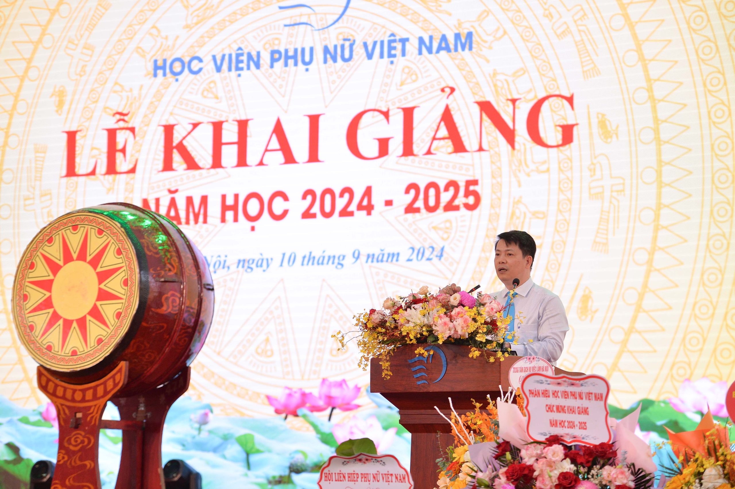 Phát biểu tại buổi lễ, PGS. TS Trần Quang Tiến, Bí thư Đảng ủy, Giám đốc Học viện Phụ nữ Việt Nam, gửi lời chúc mừng tới toàn thể các tân sinh viên. Giám đốc nhấn mạnh: “Các em đã vượt qua kỳ xét tuyển đầy thử thách và trở thành thành viên của một trong những ngôi trường có truyền thống và uy tín trong lĩnh vực giáo dục tại Việt Nam. Học viện Phụ nữ Việt Nam không chỉ là nơi đào tạo, mà còn là môi trường giúp các em phát triển toàn diện từ kiến thức chuyên môn đến kỹ năng xã hội, hướng tới tương lai tươi sáng.”