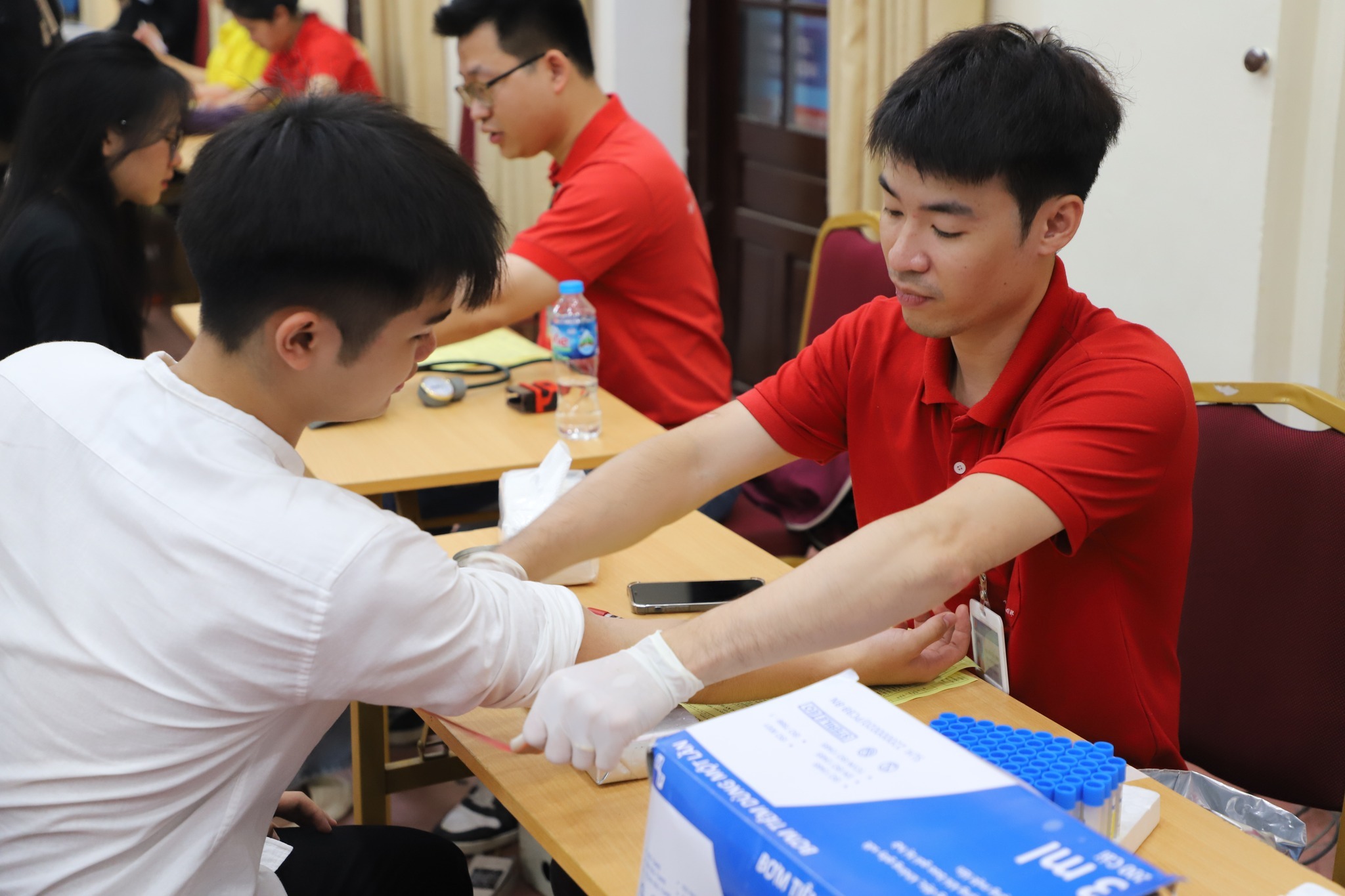 Ngay từ 7h30 sáng, không khí tại khu vực hiến máu đã rộn ràng, sôi động. Trong sắc áo đỏ đặc trưng, các bạn sinh viên háo hức đến đăng ký, kiểm tra sức khỏe và chuẩn bị cho hành trình “cho đi là còn mãi”. Các tình nguyện viên có mặt từ rất sớm để hỗ trợ hướng dẫn, tư vấn, chăm sóc người tham gia – tạo nên một ngày hội không chỉ an toàn mà còn đầy ắp yêu thương.