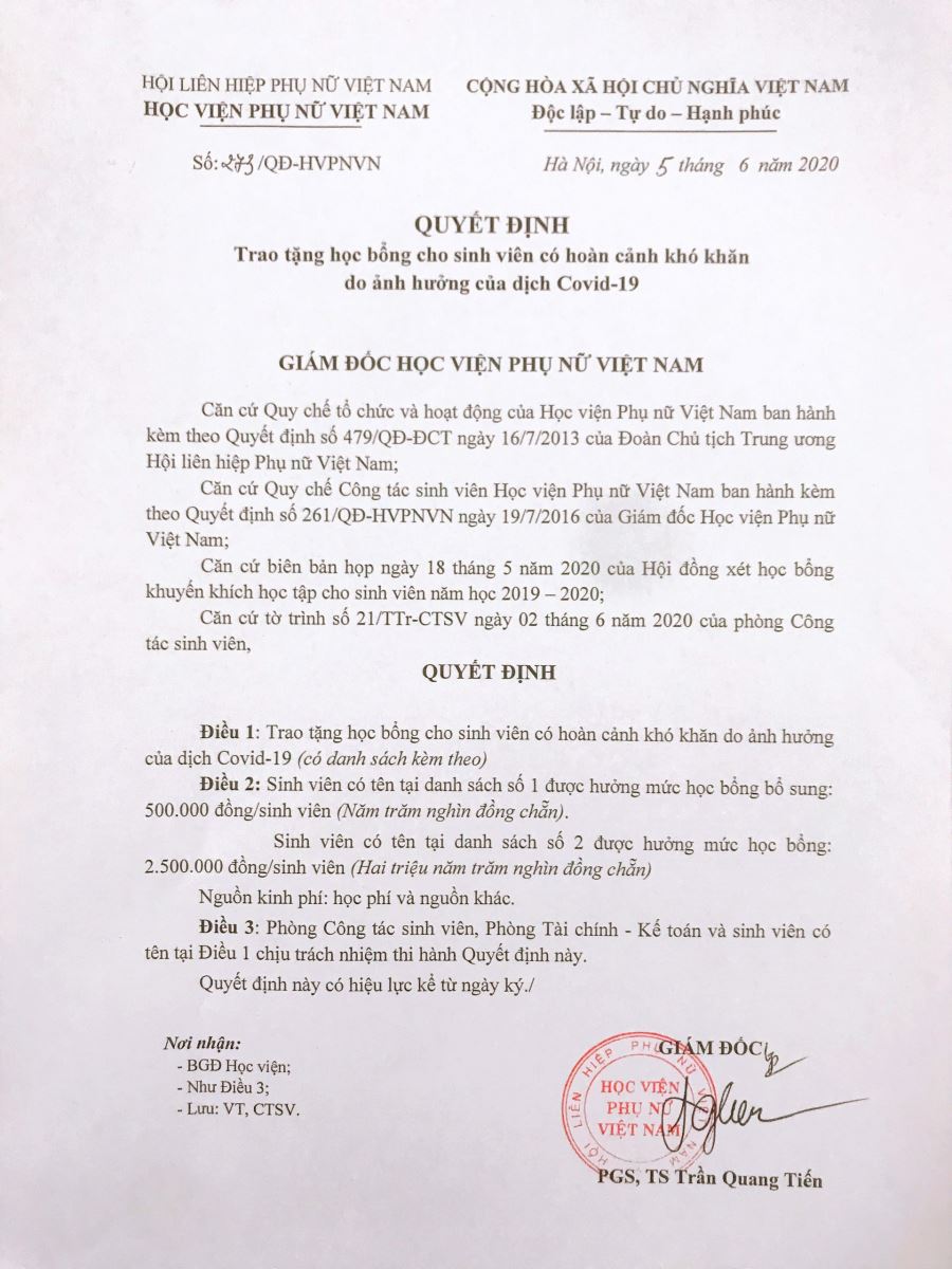 Quyết định trao học bổng cho SV khó khăn do ảnh hưởng dịch Covid-19