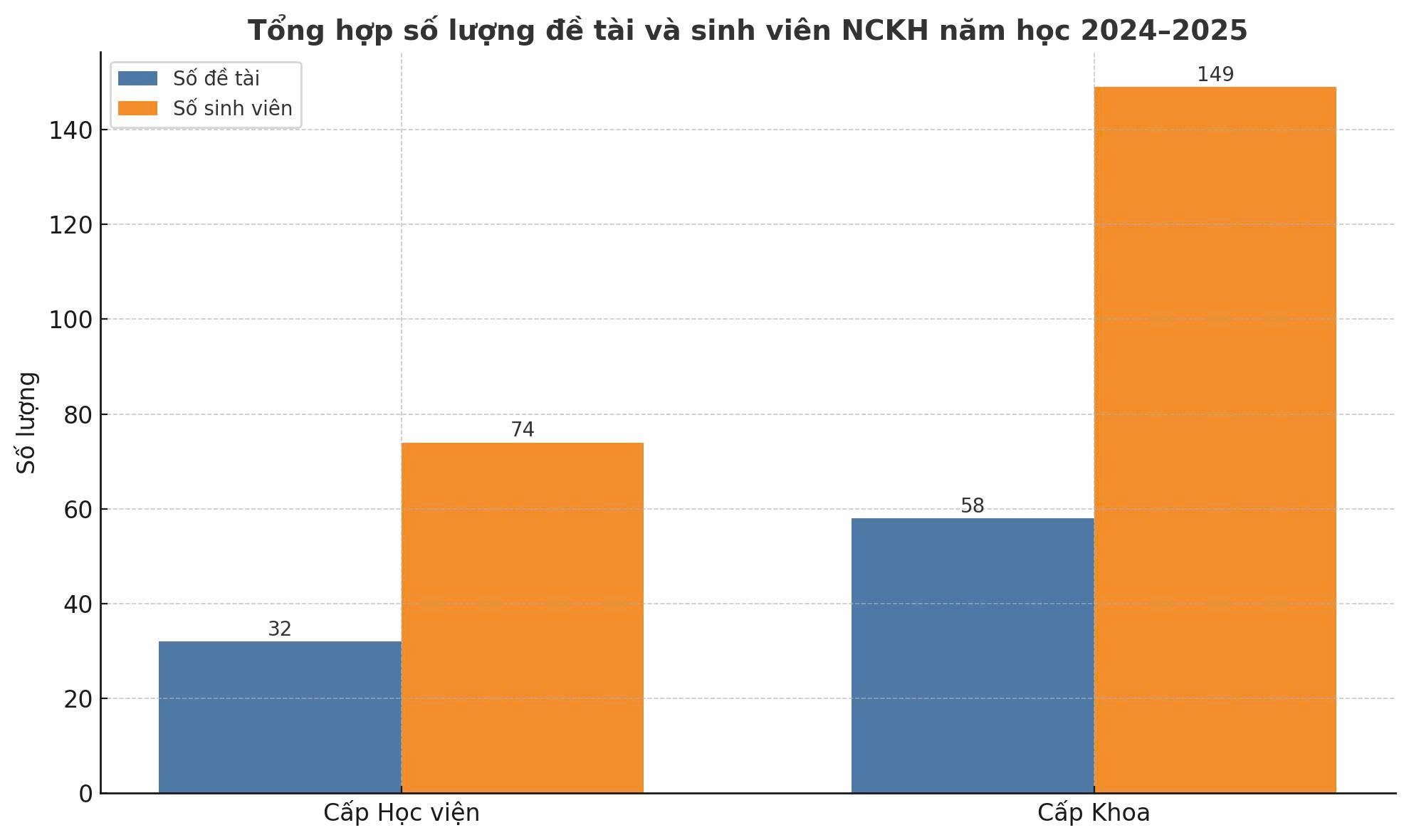 Với tổng cộng 90 đề tài nghiên cứu khoa học ở cả hai cấp Khoa và Học viện – tăng trưởng ấn tượng hơn 140% so với năm học trước – năm 2025 chứng kiến sự lan tỏa mạnh mẽ của phong trào nghiên cứu trong sinh viên toàn Học viện. 223 sinh viên đã trực tiếp tham gia thực hiện đề tài, thể hiện rõ tinh thần chủ động, say mê và trách nhiệm của thế hệ trẻ đối với việc học tập và phát triển học thuật.