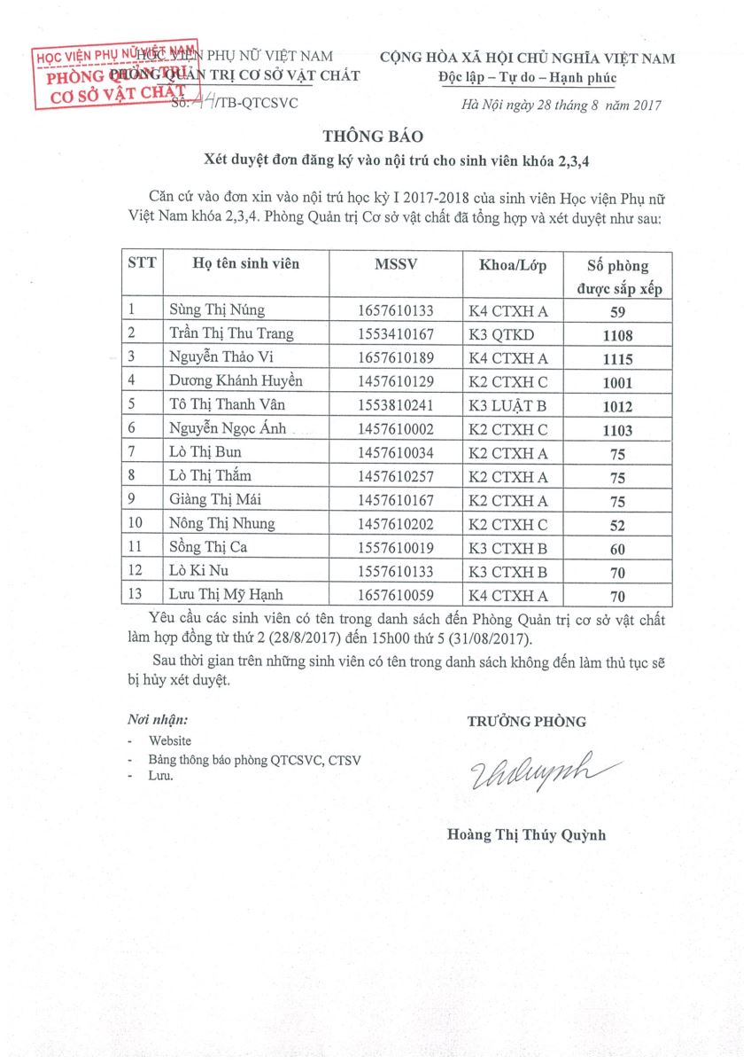 Thông báo xét duyệt đăng ký nội trú cho sinh viên Khóa 2,3,4