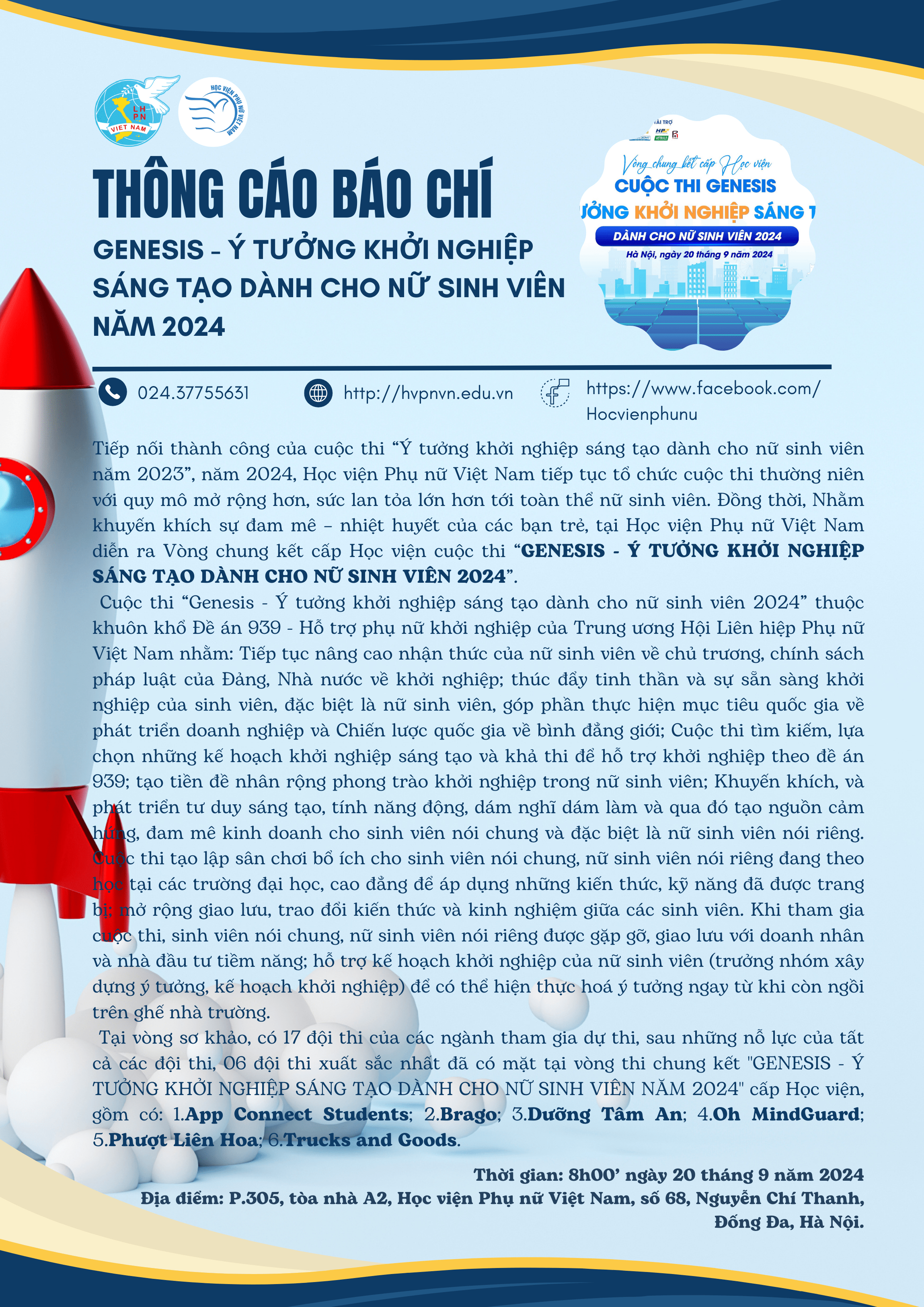 Trân trọng kính mời các đại biểu và các bạn sinh viên tới tham dự vòng chung kết cấp Học viện cuộc thi “Genesis – Ý tưởng khởi nghiệp sáng tạo dành cho nữ sinh viên năm 2024” vào lúc 8h ngày 20/9/2024 tại phòng 305, nhà A2, Học viện Phụ nữ Việt Nam.
