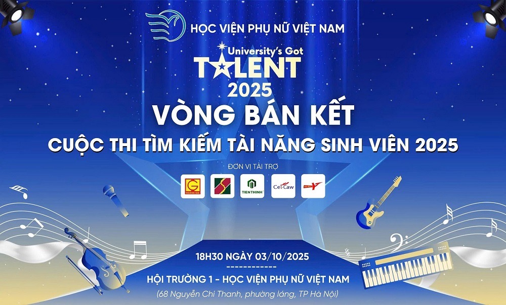 Chỉ còn 2 ngày nữa, đêm Bán kết cuộc thi “Tìm kiếm tài năng sinh viên – University’s Got Talent 2025” sẽ chính thức diễn ra vào lúc 18h30 ngày 03/10/2025 tại Hội trường 1 – Học viện Phụ nữ Việt Nam (68 Nguyễn Chí Thanh, Hà Nội). Đây là sự kiện được mong chờ nhất trong chuỗi hành trình tìm kiếm và tỏa sáng những gương mặt sinh viên tài năng.