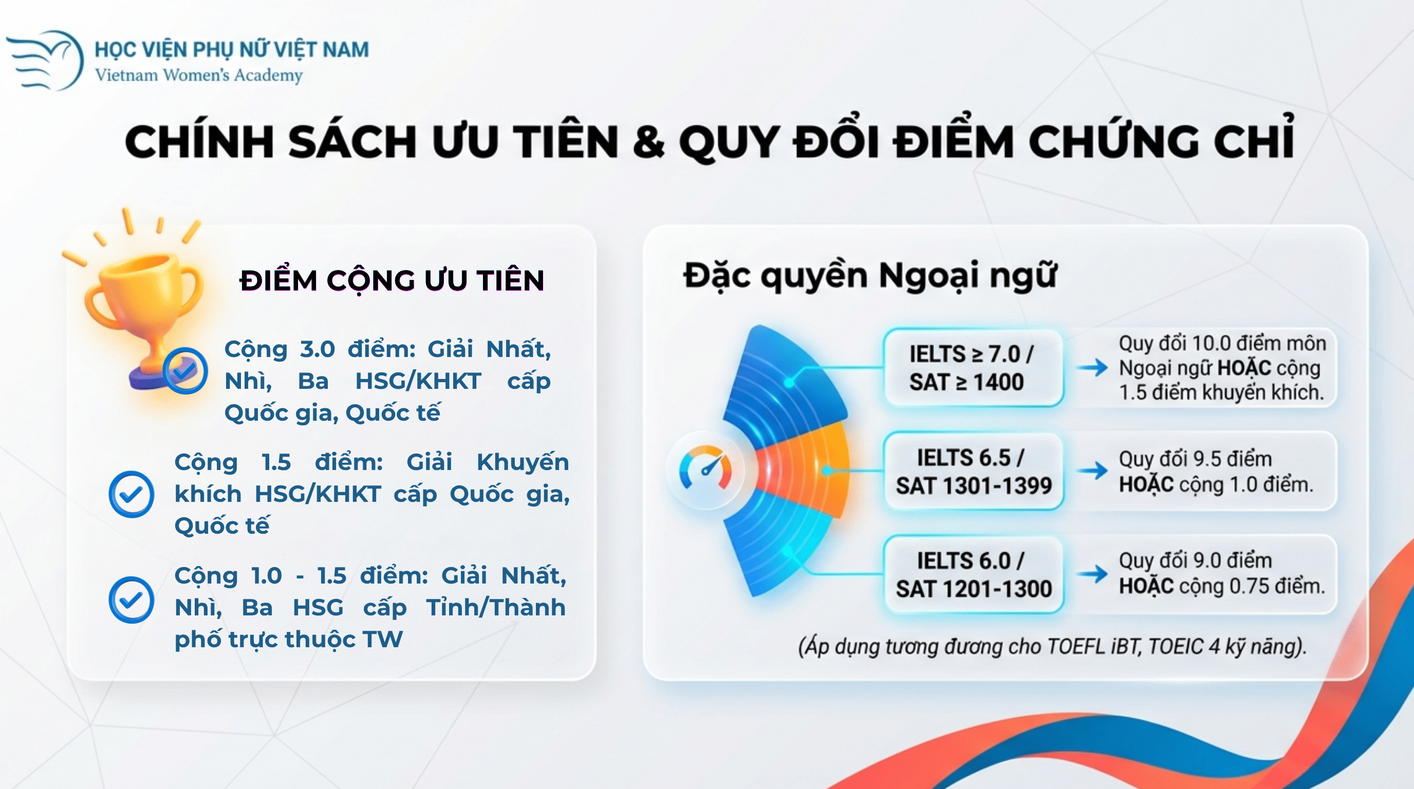 Với chính sách quy đổi điểm và cộng điểm thưởng “hết mức” cho chứng chỉ quốc tế, cùng lộ trình đào tạo bài bản hướng tới chuẩn quốc tế, Học viện Phụ nữ Việt Nam đang tạo ra một môi trường học tập thực chất và đầy triển vọng. Nếu bạn có lợi thế về ngoại ngữ và mong muốn một sự nghiệp không giới hạn biên giới, các chương trình đào tạo chất lượng cao (đào tạo chủ yếu bằng tiếng Anh) tại VWA chính là sự lựa chọn đáng cân nhắc trong mùa tuyển sinh 2026.