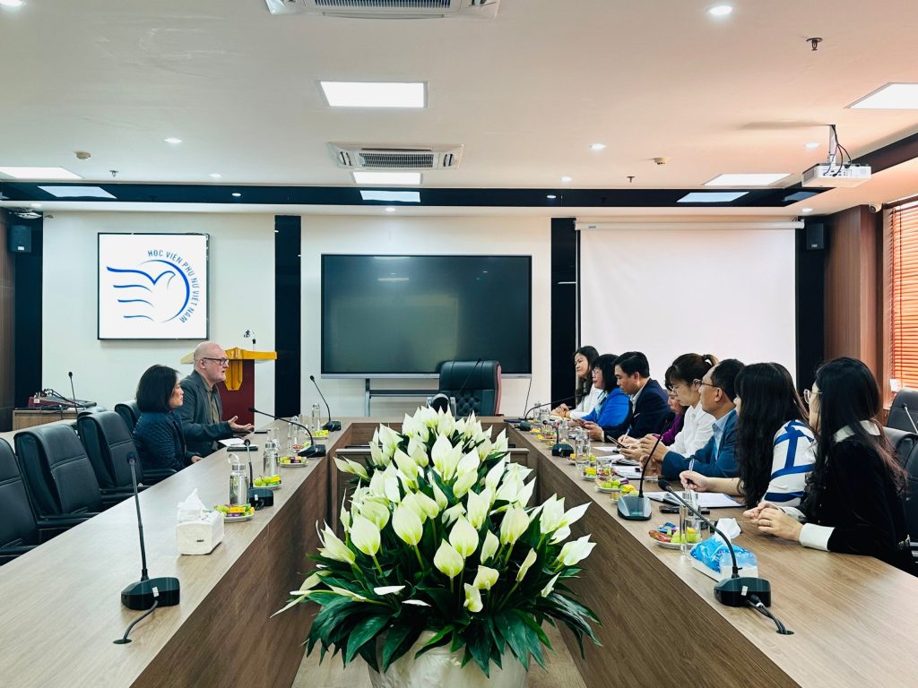 Tại buổi làm việc, hai bên đã trao đổi chi tiết về các cơ hội hợp tác trong thời gian tới giữa Học viện và AVP. Ông David đánh giá Học viện là một đối tác đã thực hiện rất nhiều hoạt động thành công, hiệu quả, để lại dấu ấn sâu đậm đối với AVP. Ông rất vui khi được chứng kiến sự phát triển không ngừng của Học viện trong thời gian qua và mong sẽ có một hoạt động dài hạn với Học viện, trong nhiều hoạt động, lĩnh vực đa dạng hơn thông qua những cơ hội hỗ trợ các hoạt động đào tạo, bồi dưỡng và nghiên cứu cho Học viện trong thời gian tới. Ngoài ra, ông cũng nhấn mạnh một số khó khăn, vướng mắc mà AVP đang gặp phải trong quá trình triển khai chương trình tình nguyện viên tại Việt Nam và hướng giải quyết mà AVP đang hướng đến.