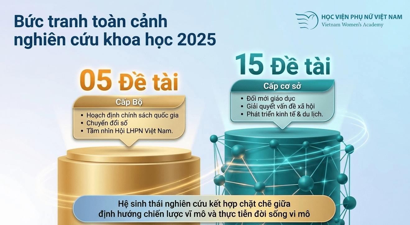 Trong bối cảnh đổi mới giáo dục đại học gắn với yêu cầu phát triển khoa học công nghệ và phục vụ cộng đồng, hoạt động nghiên cứu tại Học viện Phụ nữ Việt Nam đang cho thấy những chuyển động rõ nét cả về chiều rộng lẫn chiều sâu. Năm 2025, Học viện triển khai đồng thời 4 đề tài nghiên cứu khoa học cấp Bộ và hơn 15 đề tài cấp cơ sở, tạo nên một hệ thống nghiên cứu tương đối toàn diện, vừa mang tính chiến lược, vừa gắn chặt với thực tiễn đời sống.