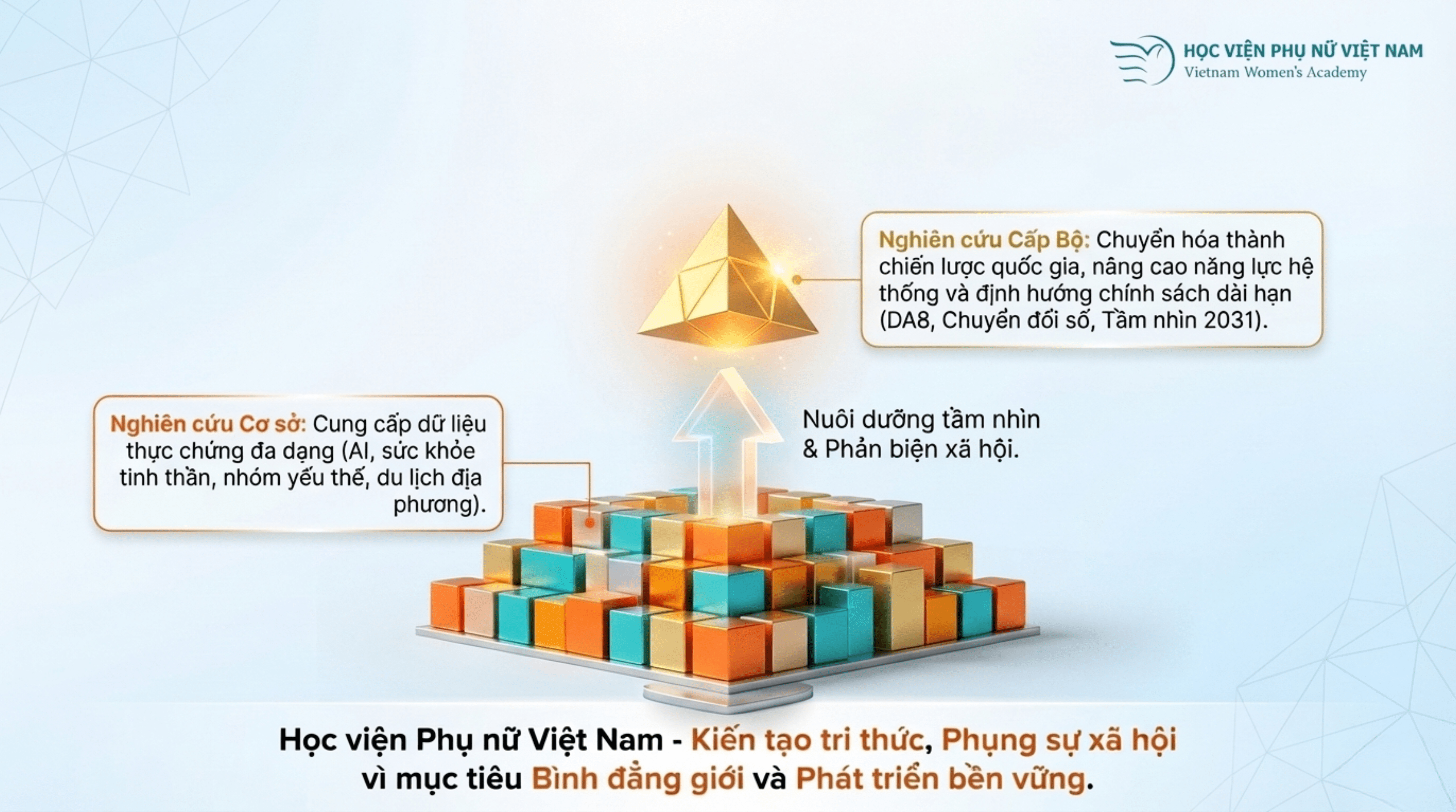 Trong bối cảnh đổi mới giáo dục đại học gắn với yêu cầu phát triển khoa học công nghệ và phục vụ cộng đồng, hoạt động nghiên cứu tại Học viện Phụ nữ Việt Nam đang cho thấy những chuyển động rõ nét cả về chiều rộng lẫn chiều sâu. Năm 2025, Học viện triển khai đồng thời 4 đề tài nghiên cứu khoa học cấp Bộ và hơn 15 đề tài cấp cơ sở, tạo nên một hệ thống nghiên cứu tương đối toàn diện, vừa mang tính chiến lược, vừa gắn chặt với thực tiễn đời sống.