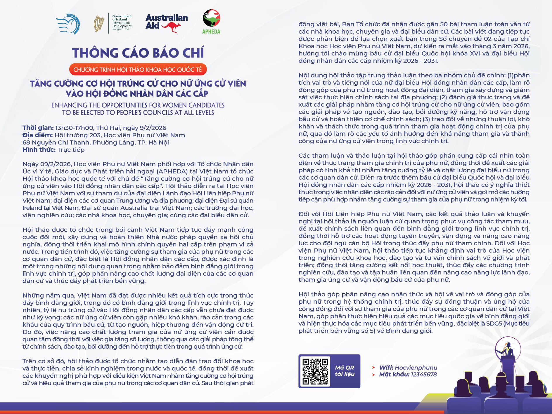 THÔNG TIN HỘI THẢO KHOA HỌC QUỐC TẾ: TĂNG CƯỜNG CƠ HỘI TRÚNG CỬ CHO NỮ ỨNG VIÊN VÀO HỘI ĐỒNG NHÂN DÂN CÁC CẤP