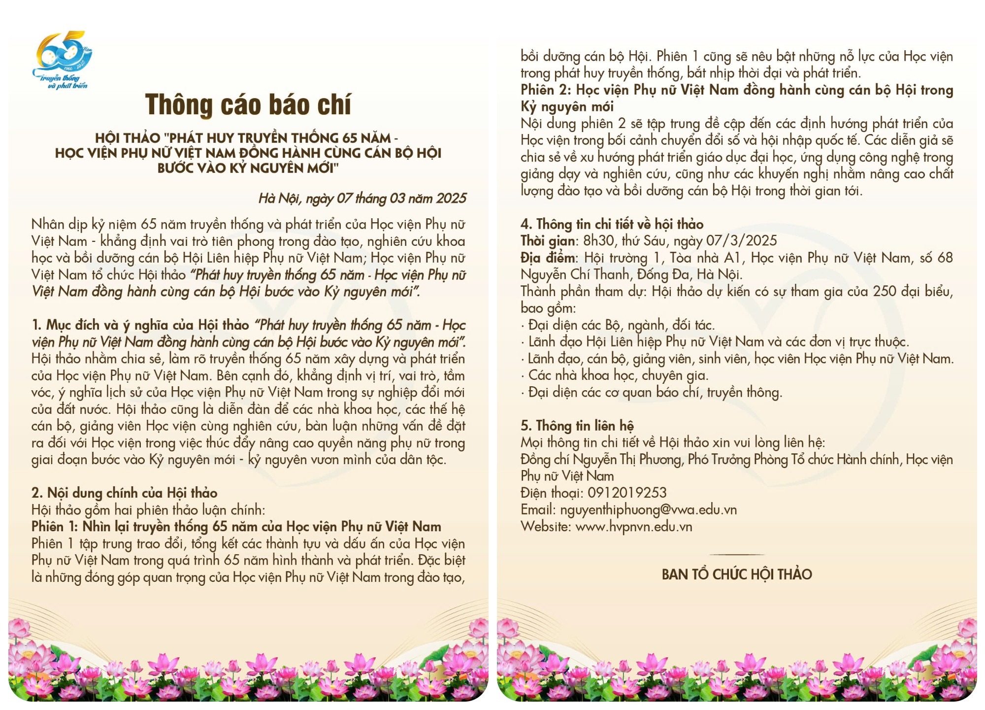 Thông cáo báo chí Hội thảo: “Phát huy truyền thống 65 năm – Học viện Phụ nữ Việt Nam đồng hành cùng cán bộ Hội bước vào Kỷ nguyên mới”