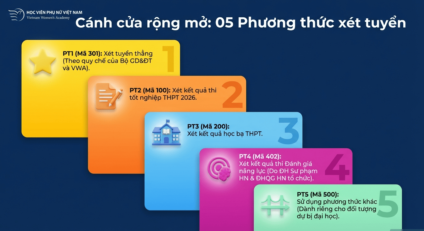 Năm 2026, Học viện tiếp tục áp dụng 5 phương thức tuyển sinh mở rộng cơ hội cho thí sinh:
