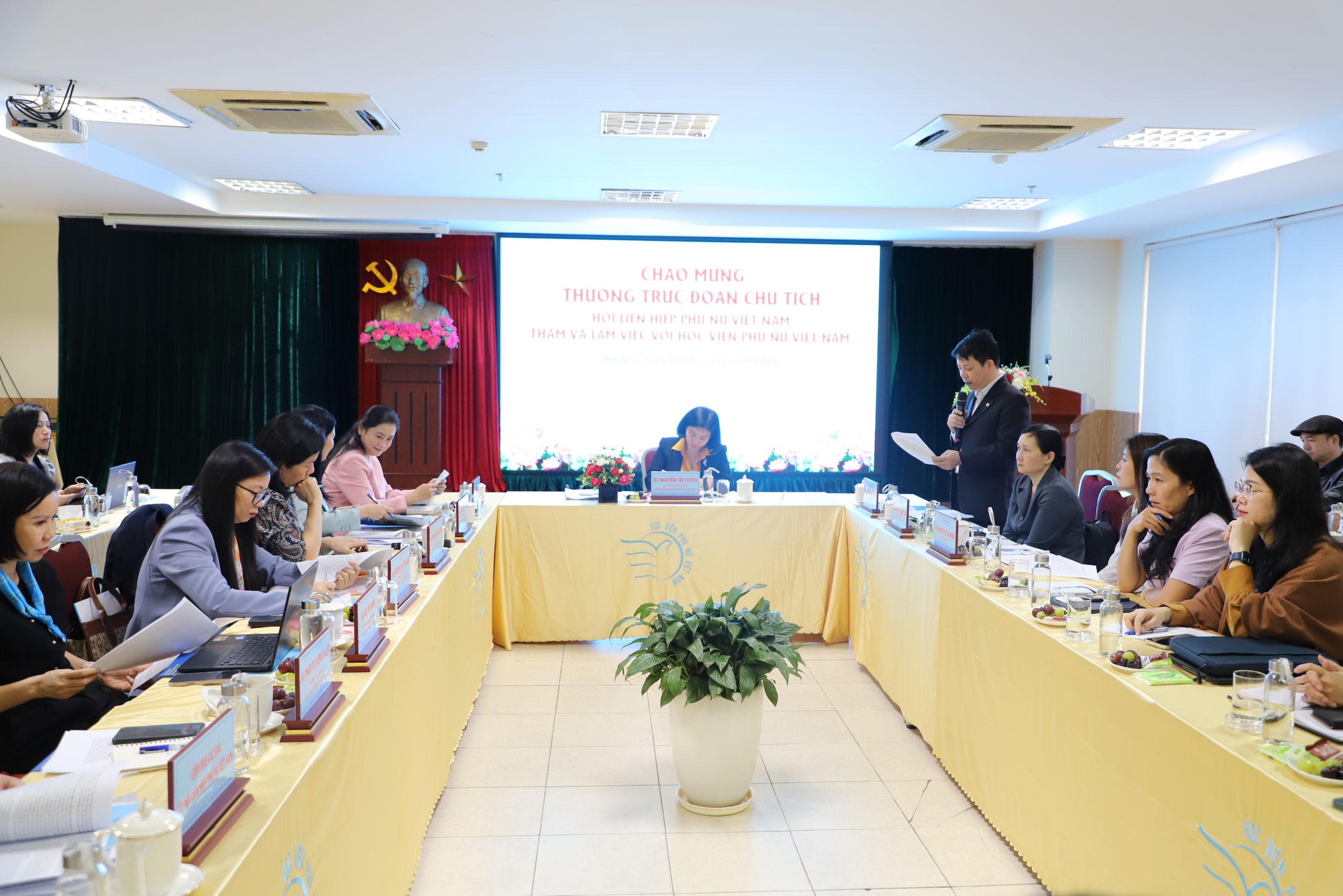Tham dự chương trình làm việc có Phó Chủ tịch Thường trực Hội LHPN Việt Nam Đỗ Thị Thu Thảo; các Phó Chủ tịch Hội LHPN Việt Nam: Trần Lan Phương, Nguyễn Thị Minh Hương, Nguyễn Thị Thu Hiền; đại diện lãnh đạo các Ban thuộc TƯ Hội LHPN; Ban Giám đốc và cán bộ chủ chốt của Học viện.