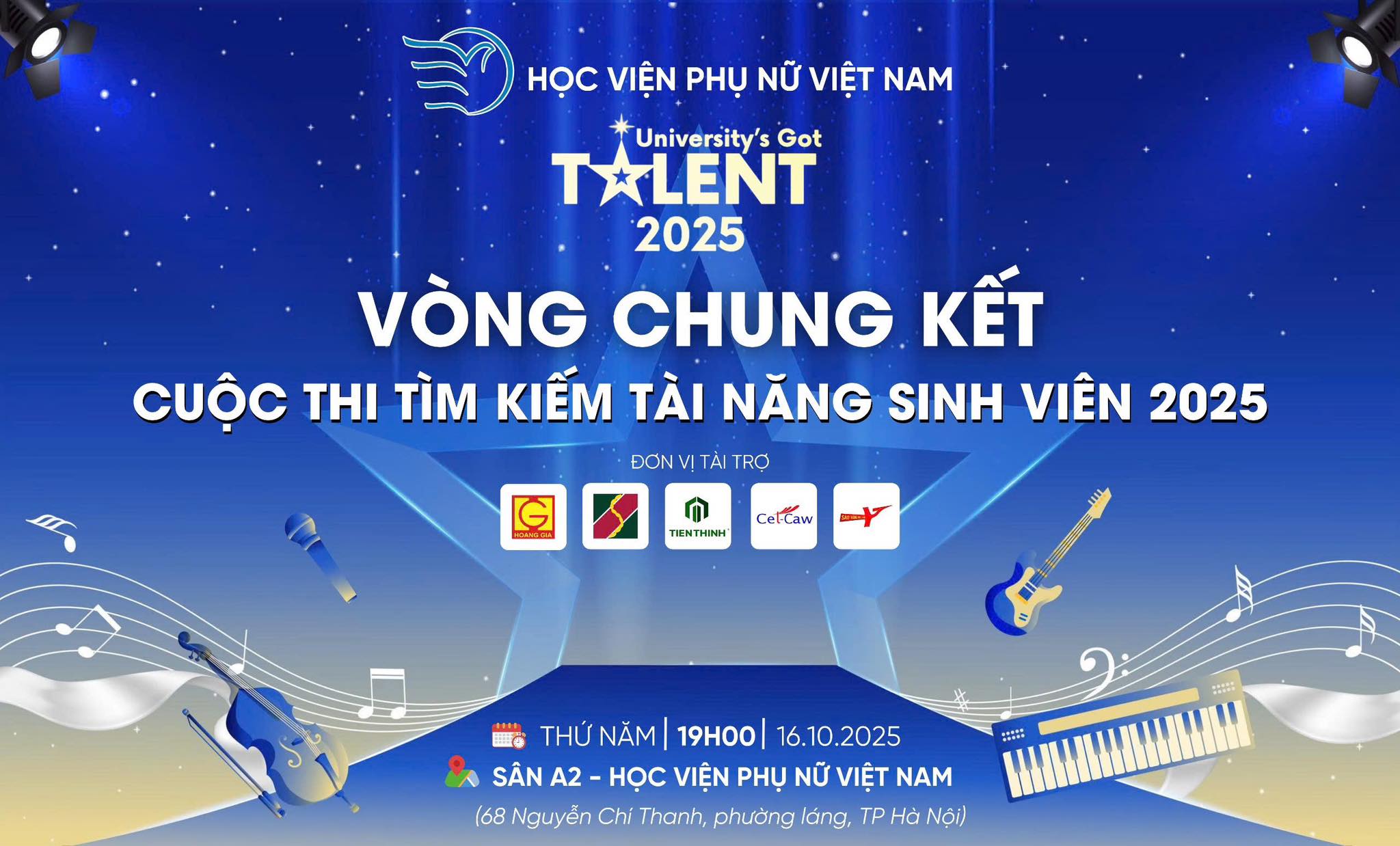 Sau hành trình dài đầy cảm xúc và sáng tạo, cuộc thi Tìm kiếm Tài năng Sinh viên – University’s Got Talent 2025 do Học viện Phụ nữ Việt Nam chủ trì phối hợp cùng các trường đại học và THPT với quy mô toàn quốc đang bước vào giai đoạn được mong chờ nhất – Vòng Chung kết, sẽ diễn ra vào 19h00, Thứ Năm ngày 16/10/2025 tại Sân A2 – Học viện Phụ nữ Việt Nam (68 Nguyễn Chí Thanh, Hà Nội).