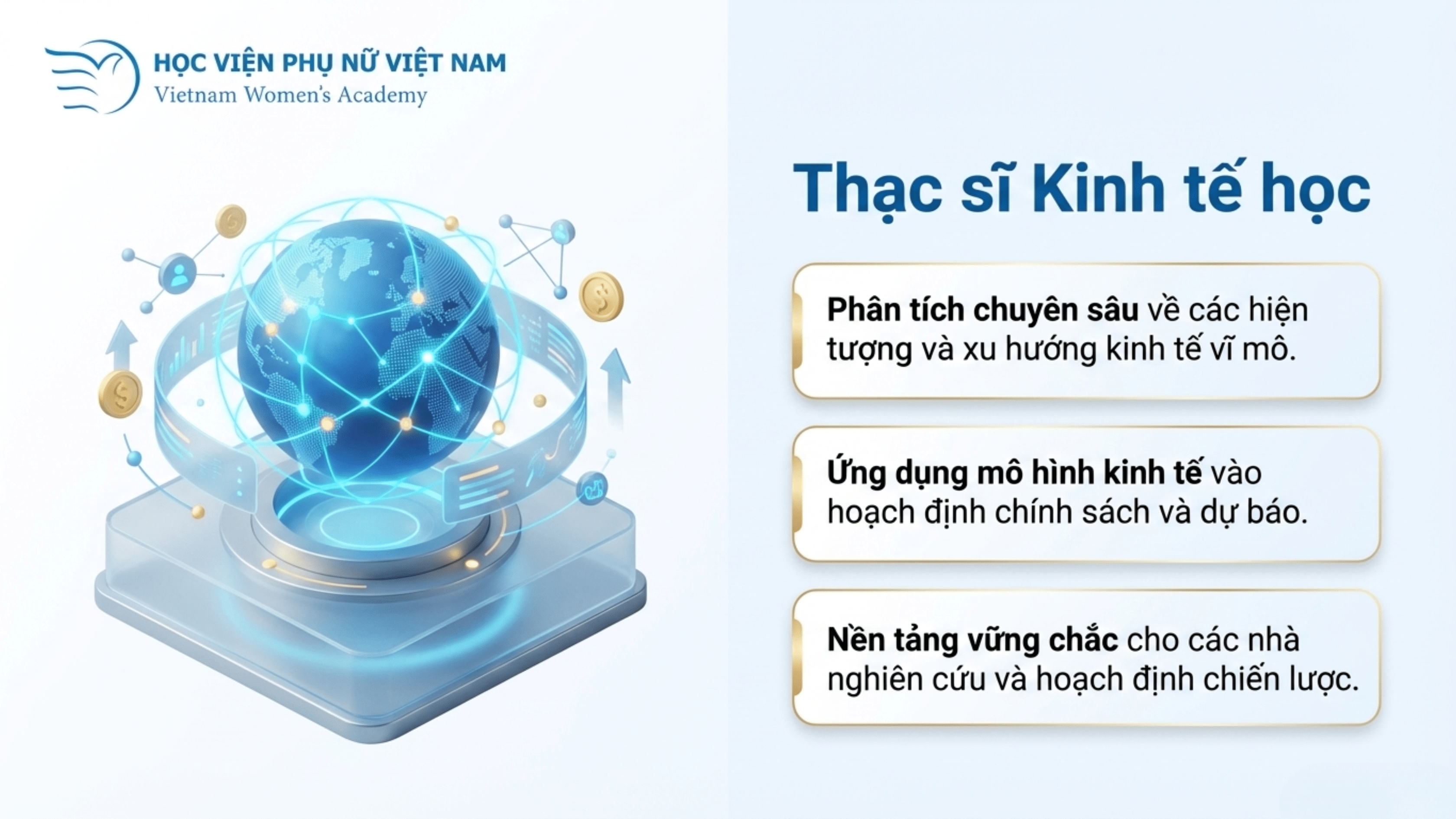 Trong khi đó, ngành Kinh tế học tập trung cung cấp nền tảng kiến thức vĩ mô, đồng thời phát triển kỹ năng phân tích, đánh giá và hoạch định chính sách kinh tế. Đây là ngành học phù hợp với những người mong muốn làm việc trong các cơ quan quản lý nhà nước, tổ chức nghiên cứu, hoặc các doanh nghiệp có nhu cầu phân tích thị trường và chiến lược phát triển. Trong bối cảnh nền kinh tế toàn cầu có nhiều biến động, việc đào tạo nguồn nhân lực có khả năng tư duy phân tích và dự báo kinh tế được xem là hết sức cần thiết.