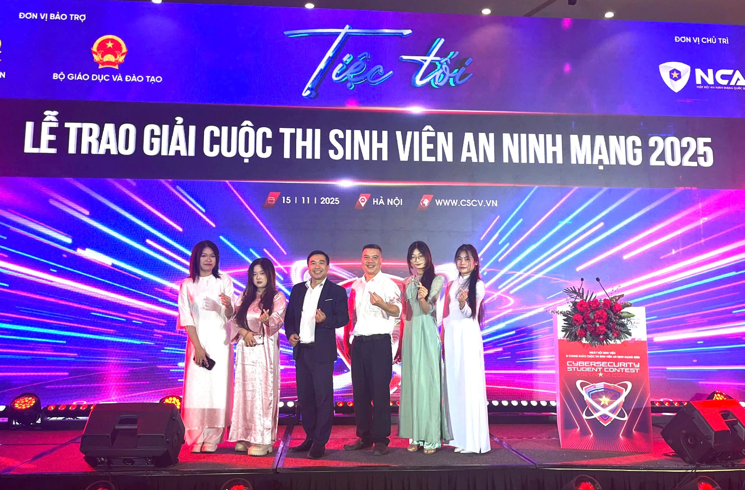 TS. Nguyễn Đức Toàn – Phó Viện trưởng phụ trách Viện CNTT (áo đen) và ThS. Bùi Tiến Trường – Giảng viên hướng dẫn các đội dự thi cùng các thành viên Đội nữ xuất sắc nhất cuộc thi tại Lễ trao giải Sinh viên An ninh mạng 2025