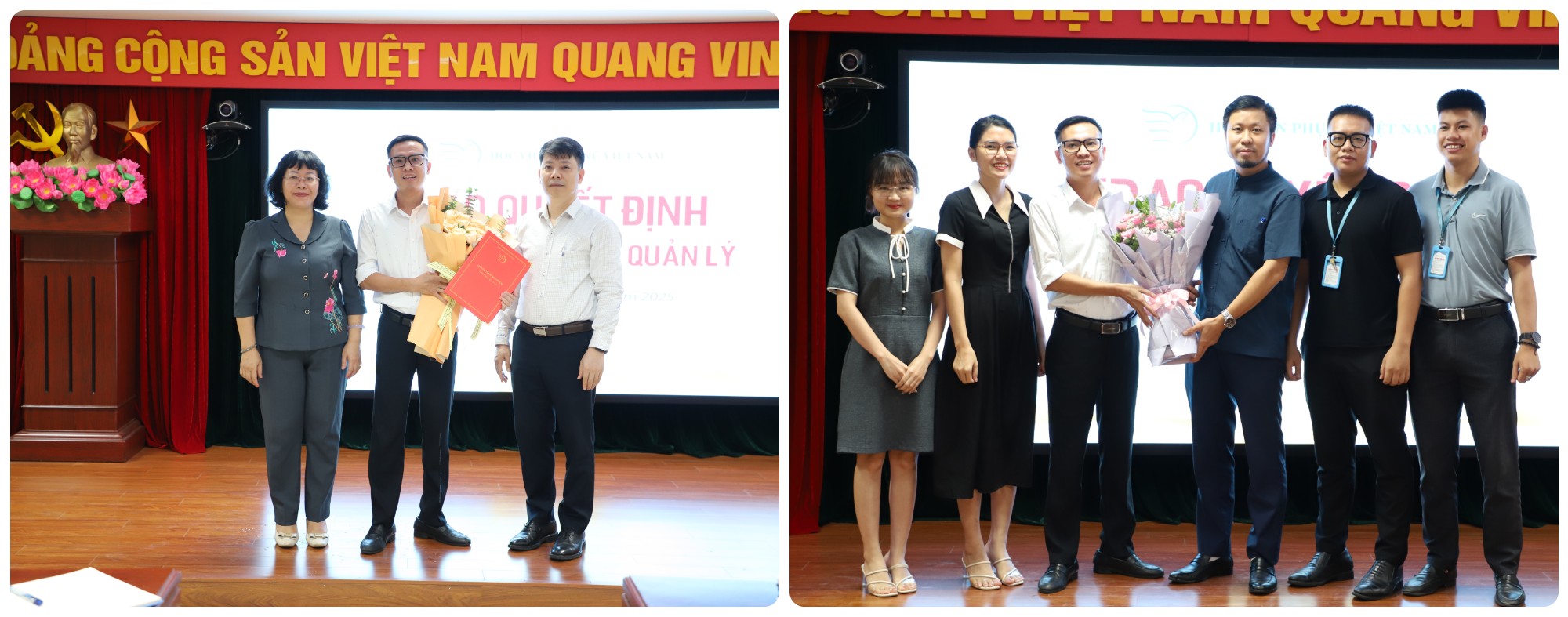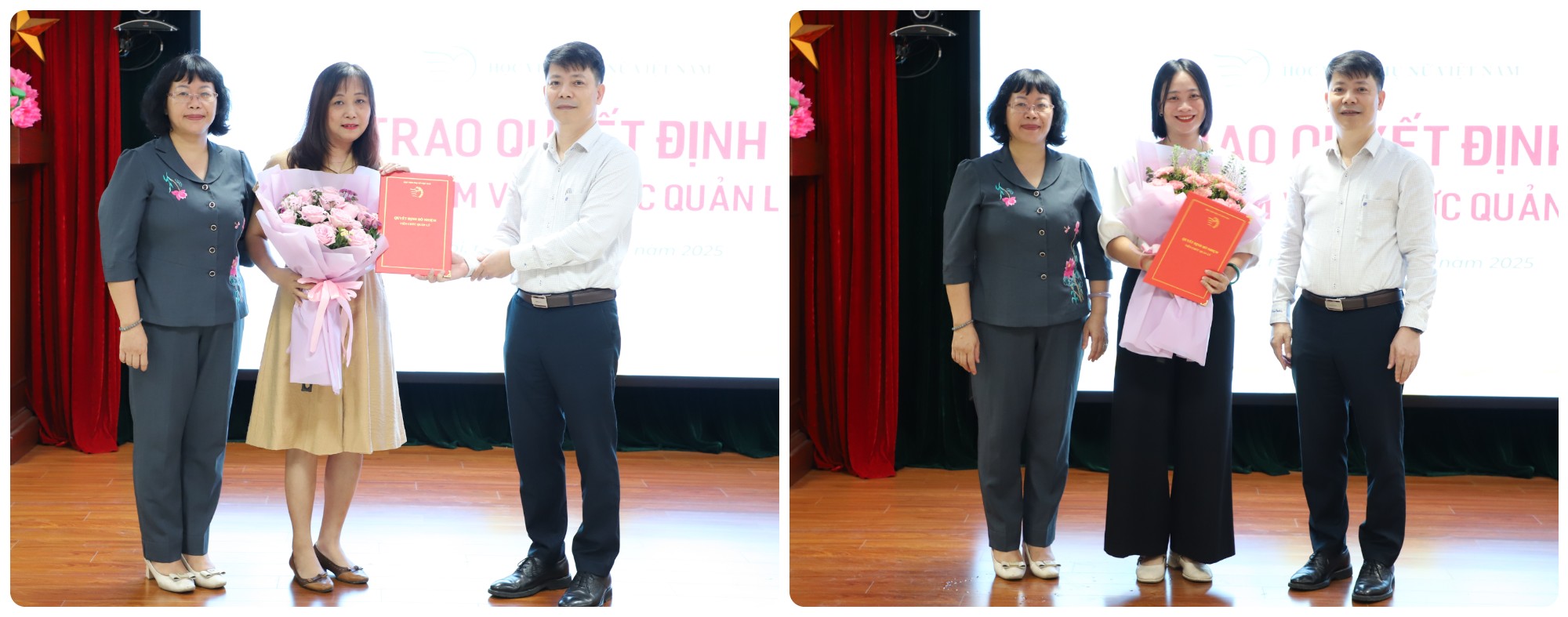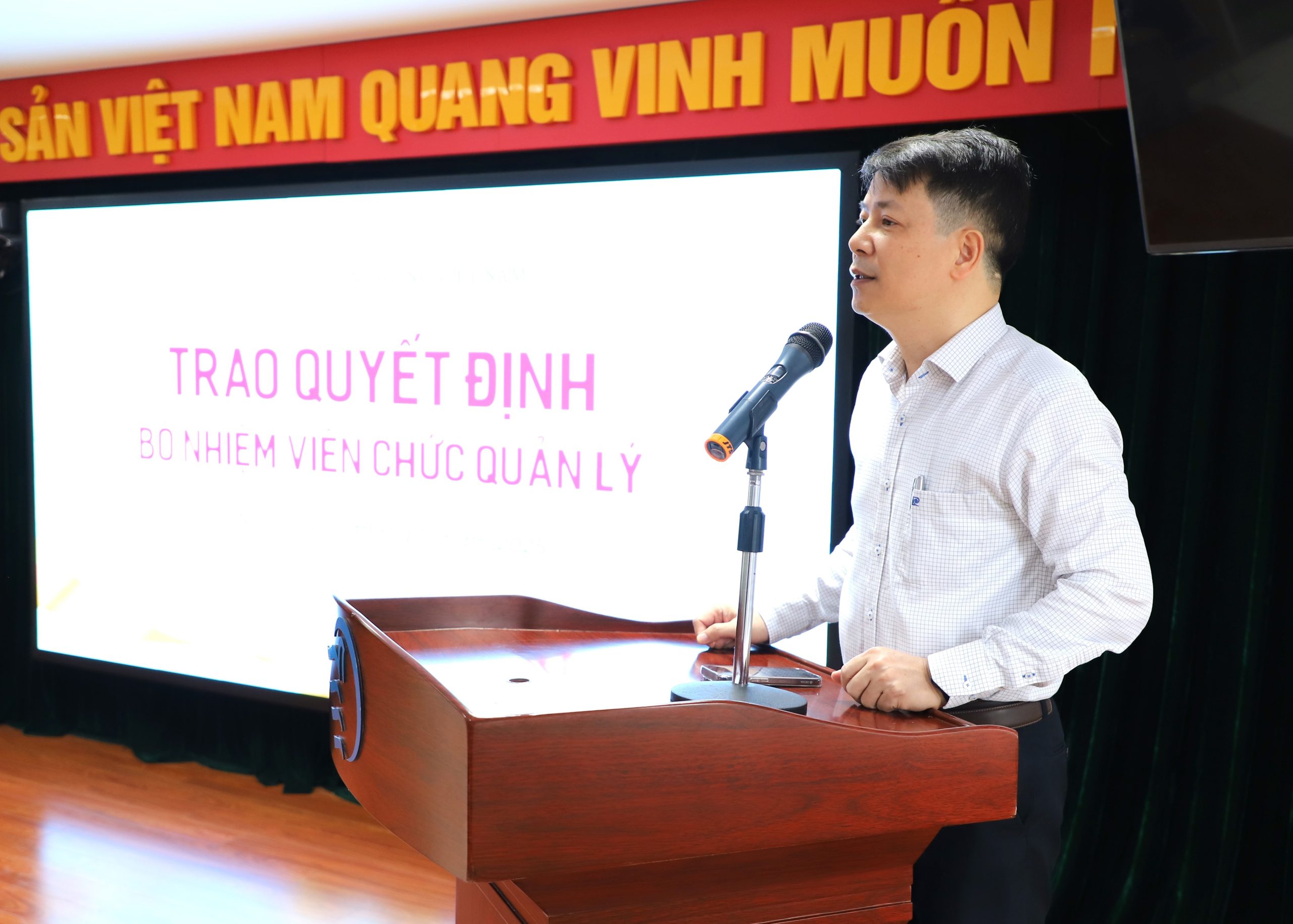 Tại chương trình, ThS. Trần Thị Vân Oanh – Trưởng Phòng Tổ chức Hành chính đã công bố Quyết định bổ nhiệm đối với 8 viên chức. Đại diện Ban Giám đốc Học viện, PGS. TS. Trần Quang Tiến – Phó Bí thư Đảng ủy, Giám đốc Học viện và PGS.TS. Dương Kim Anh – Bí thư Đảng ủy, Phó Giám đốc Học viện đã trao quyết định bổ nhiệm và giao nhiệm vụ cho các đồng chí: