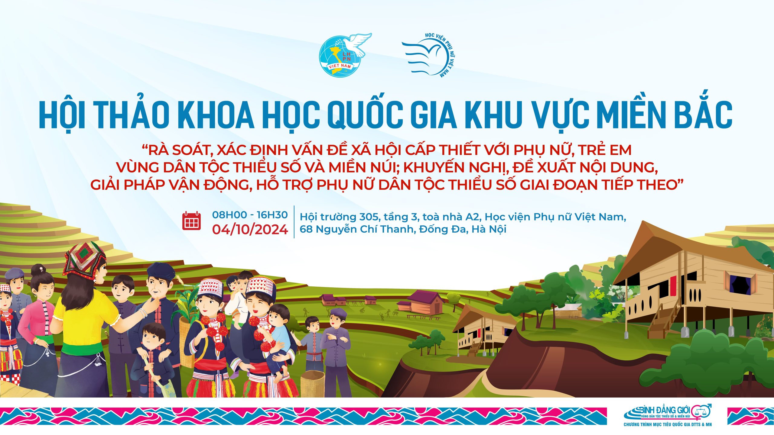Học viện Phụ nữ Việt Nam trân trọng kính mời các đại biểu tham dự hội thảo Khoa học Quốc gia khu vực Miền Bắc: “Rà soát, xác định vấn đề xã hội cấp thiết với phụ nữ, trẻ em vùng dân tộc thiểu số và miền núi; khuyến nghị, đề xuất nội dung, giải pháp vận động, hỗ trợ phụ nữ dân tộc thiểu số giai đoạn tiếp theo”.