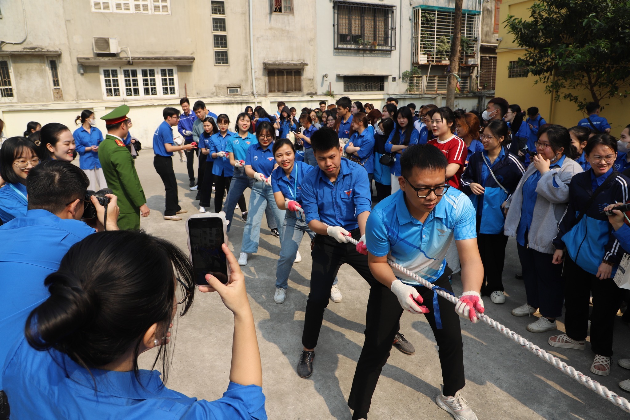 Ngay sau nội dung cầu lông, khu vực sân chính của Học viện trở nên náo nhiệt với bộ môn kéo co. Những tiếng hò hét cổ vũ vang dội cả một góc sân, tiếp thêm sức mạnh cho các đội thi đấu. Các thành viên của mỗi đội cùng nhau phối hợp nhịp nhàng, siết chặt tay kéo sợi dây thừng với quyết tâm cao độ. Những giọt mồ hôi lăn dài trên trán, đôi chân bám chặt xuống nền đất, từng cú kéo đều khiến khán giả hồi hộp. Sau nhiều lượt đấu căng thẳng, đội đến từ Khoa Luật đã xuất sắc giành chiến thắng nhờ chiến thuật hợp lý và sự phối hợp ăn ý của các thành viên với giải nhất thuộc về ngành Luật Kinh tế và giải Nhì thuộc về ngành Luật.