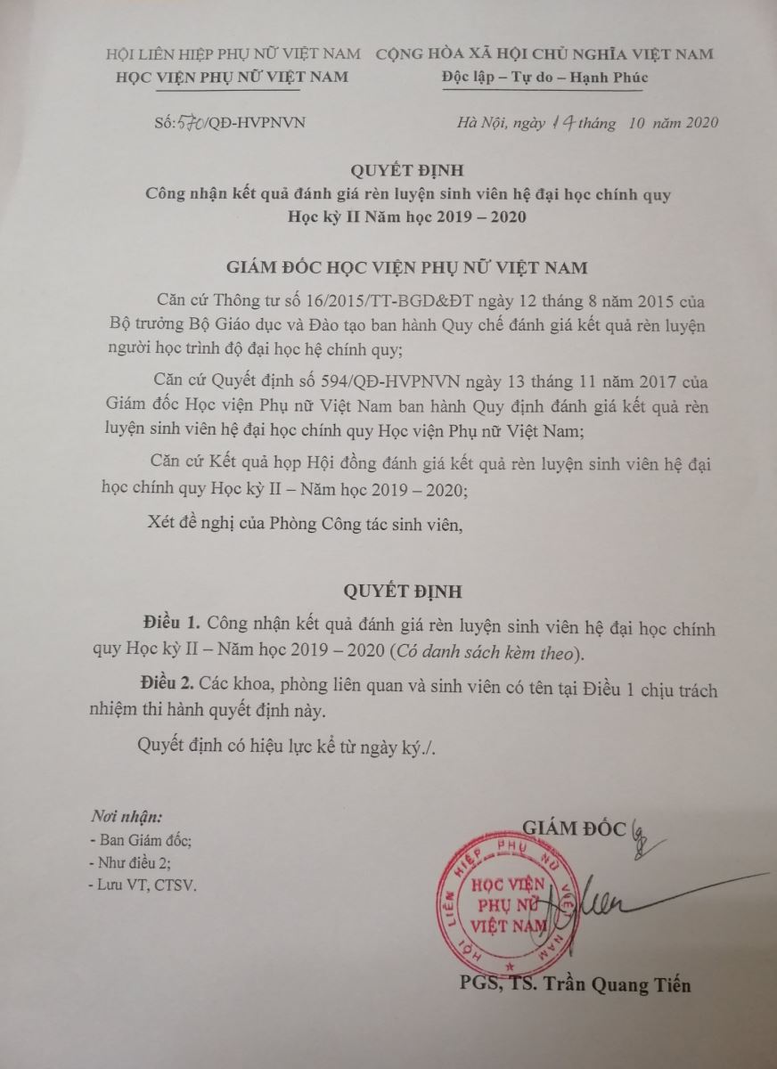 Học viện Phụ nữ Việt Nam thông báo kết quả xét tuyển trình độ thạc sĩ đợt 2 năm 2025.