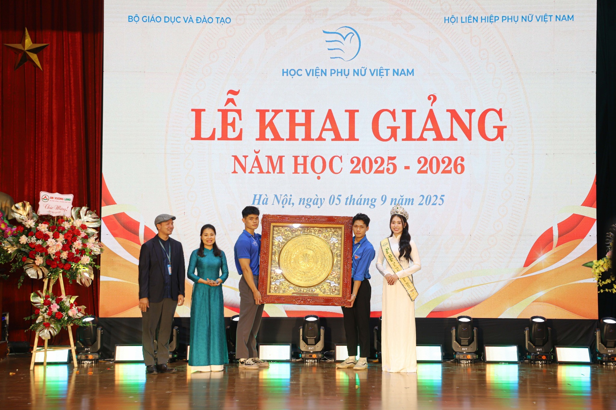 Buổi lễ có sự hiện diện của đồng chí Nguyễn Thị Minh Hương – Ủy viên Ban Thường vụ Đảng ủy Trung ương Hội, Phó Chủ tịch Hội Liên hiệp Phụ nữ Việt Nam, đại diện các cơ quan ban ngành, các doanh nghiệp, đối tác, nhà tài trợ, cùng các cơ quan báo chí. Về phía Học viện có đồng chí Nguyễn Thị Thu Hương – Phó Giám đốc Học viện, lãnh đạo các đơn vị, tổ chức đoàn thể, cán bộ, giảng viên, người lao động và các học viên, sinh viên. Đặc biệt, buổi lễ năm nay vinh dự có sự tham dự và chúc mừng của Hoa hậu Trái đất Việt Nam 2025 – Ngô Thị Trâm Anh, sinh viên Khoa Quản trị kinh doanh, Học viện Phụ nữ Việt Nam. Sự xuất hiện của Trâm Anh – người trưởng thành từ cuộc thi Sinh viên thanh lịch do Học viện tổ chức – đã mang đến niềm tự hào và truyền cảm hứng mạnh mẽ đến toàn thể sinh viên trong ngày khai trường.