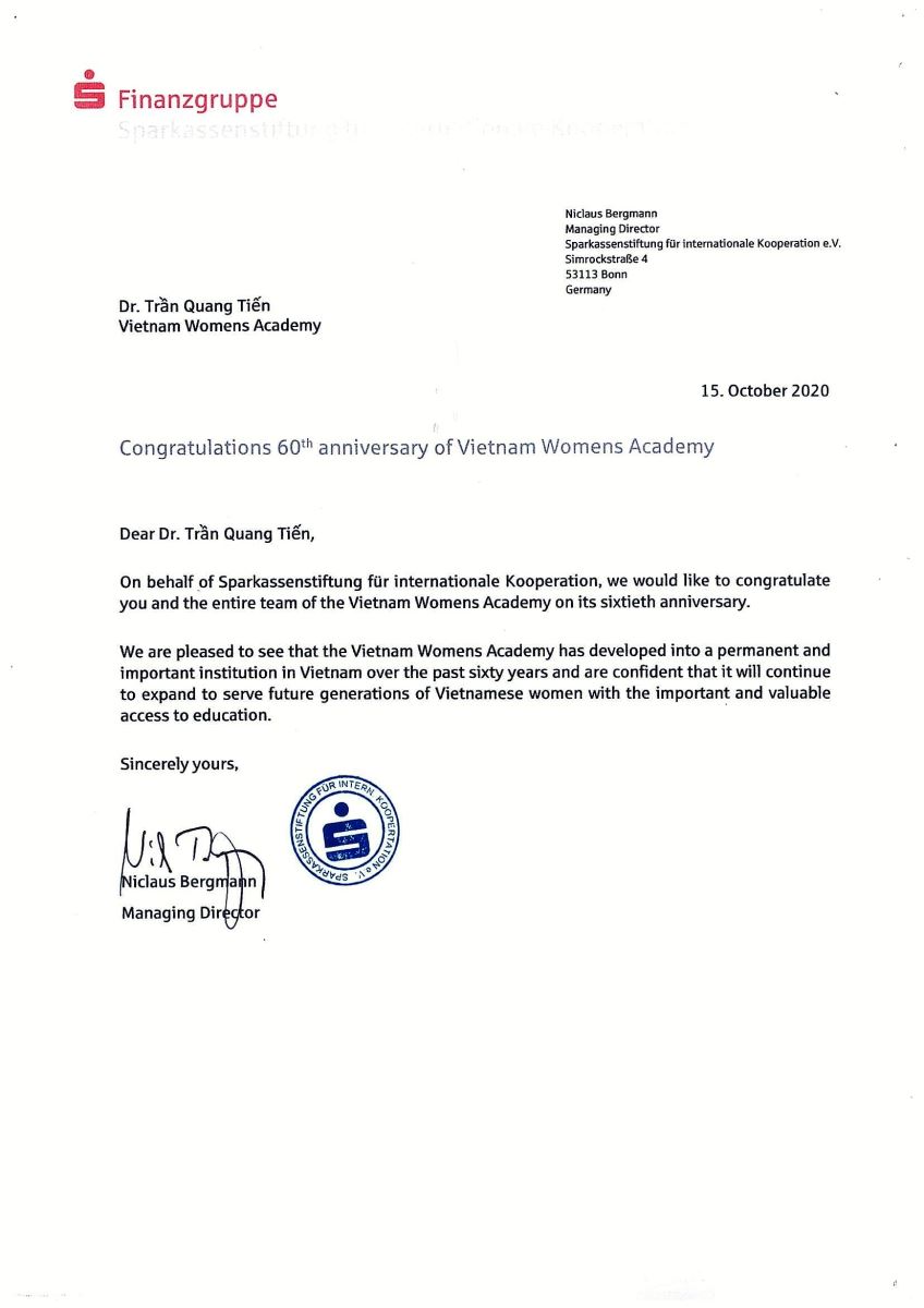Thay mặt cho Quỹ Hợp tác quốc tế, Ngân hàng Tiết kiệm Đức, chúng tôi xin được gửi lời chúc mừng tới ông và toàn thể cán bộ, giảng viên và sinh viên nhân dịp kỷ niệm 60 năm truyền thống Học viện Phụ nữ Việt Nam.