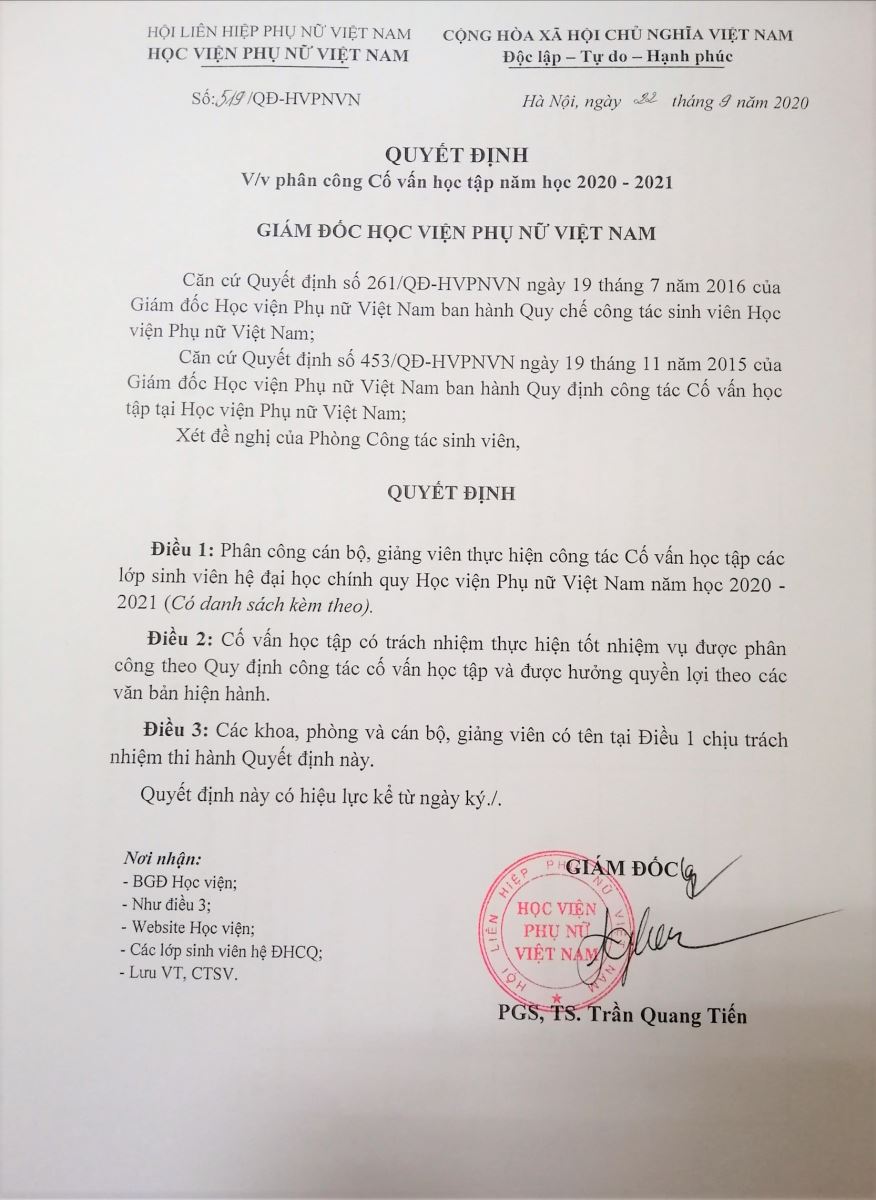 Quyết định Phân công cố vấn học tập năm học 2020 - 2021