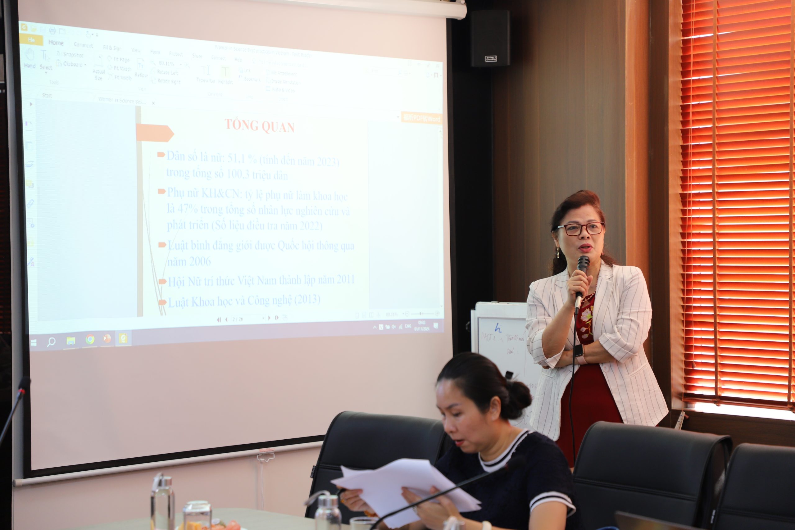 Tiếp theo, bà Lê Thị Khánh Vân, Giám đốc Trung tâm Ứng dụng Khoa học Công nghệ và Khởi nghiệp, Hội Nữ trí thức Việt Nam, chia sẻ những kết quả nghiên cứu qua bài tham luận với chủ đề “Nữ trí thức trong thời đại mới: Thực trạng và giải pháp.” Bà Khánh Vân tập trung phân tích thực trạng của phụ nữ trong các ngành khoa học công nghệ hiện nay và đưa ra các đề xuất hỗ trợ nhằm gia tăng tỉ lệ nữ giới tham gia và thành công trong các lĩnh vực này. Bà cũng nhấn mạnh sự cần thiết của các chương trình đào tạo, bồi dưỡng và khuyến khích để nữ trí thức có thể tự tin phát huy tiềm năng trong những ngành nghề yêu cầu trình độ chuyên môn cao.