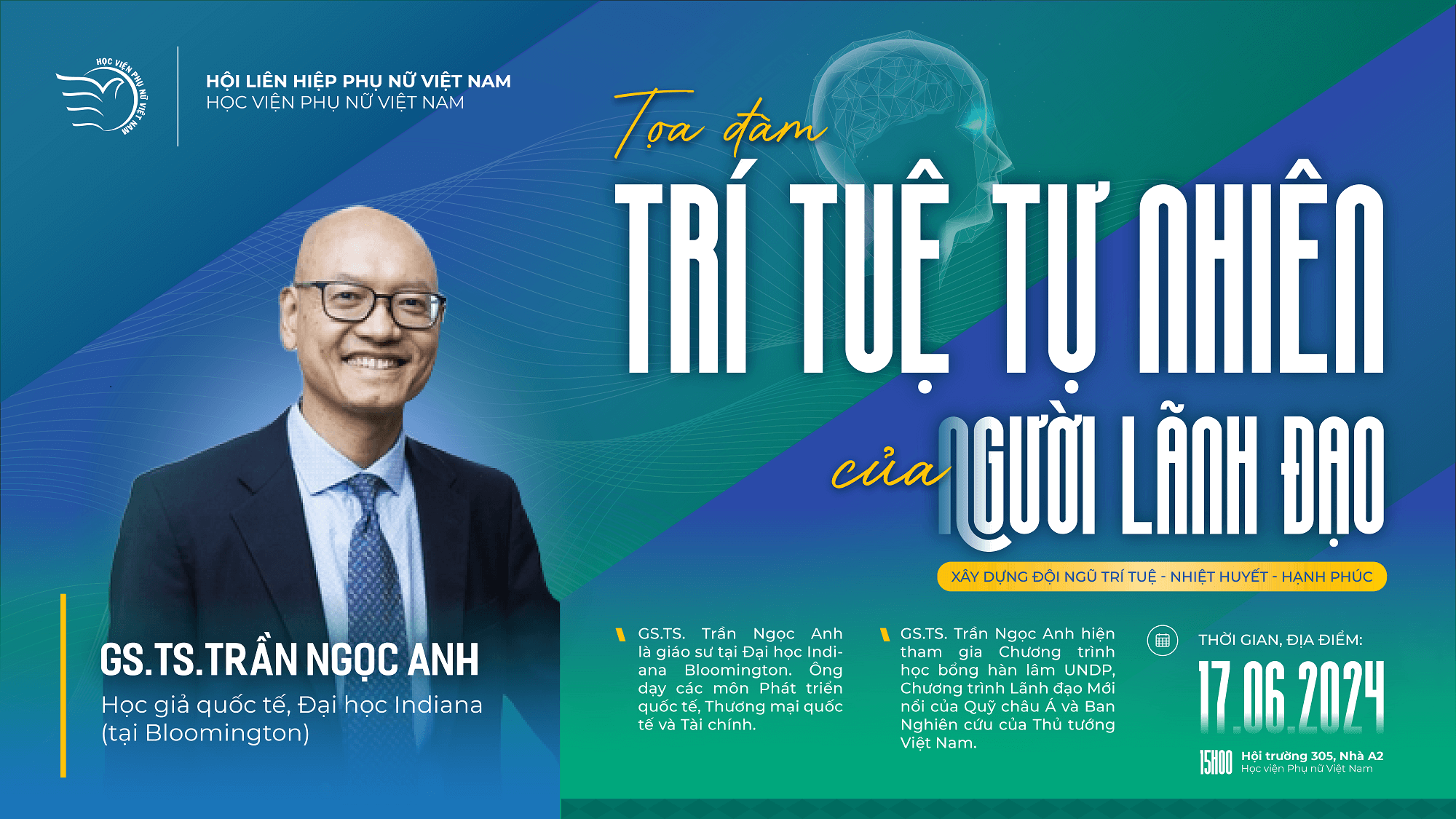 Đặc biệt, Học viện Phụ nữ Việt Nam vinh dự tiếp đón diễn giả học thuật nổi tiếng GS. TS. Trần Ngọc Anh – Học giả quốc tế, Đại học Indiana, Mỹ chia sẻ về chủ đề: Trí tuệ Tự nhiên của người lãnh đạo (Xây dựng một đội ngũ Trí tuệ – Nhiệt huyết – Hạnh phúc).