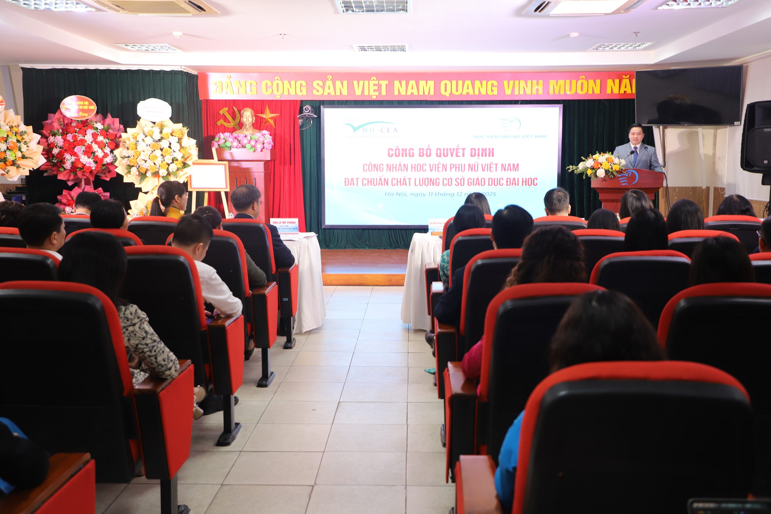 Phát biểu mở đầu tại buổi lễ, ThS. Phùng Văn Trường – Trưởng phòng Hành chính – Tổ chức, đại diện Trung tâm Kiểm định chất lượng giáo dục – ĐHQGHN đánh giá cao những nỗ lực của Học viện trong quá trình tự đánh giá và cải tiến chất lượng. ThS. Phùng Văn Trường nhấn mạnh sự phối hợp đồng bộ, hiệu quả giữa Học viện và đoàn đánh giá ngoài là minh chứng cho văn hóa chất lượng được xây dựng bài bản – yếu tố cốt lõi để một cơ sở giáo dục đặc thù như Học viện có thể phát triển bền vững. Ngay sau đó, Trung tâm chính thức công bố Quyết định công nhận Học viện Phụ nữ Việt Nam đạt chuẩn chất lượng cơ sở giáo dục chu kỳ 2.