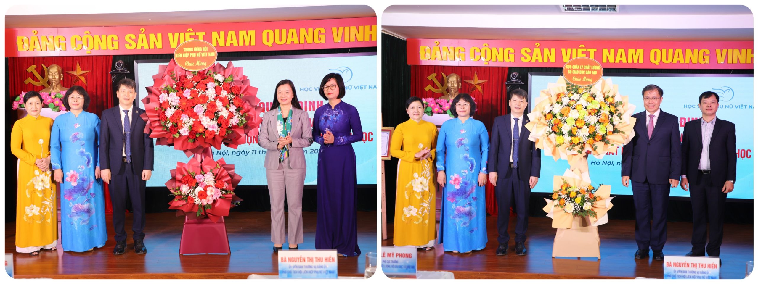 Nhân dịp này, đại diện Trung ương Hội Liên hiệp Phụ nữ Việt Nam, bà Nguyễn Thị Thu Hiền đã tặng hoa chúc mừng Học viện, khẳng định những đóng góp của Học viện trong việc đào tạo nguồn nhân lực nữ, đồng hành cùng TW Hội trong thực hiện nhiệm vụ chính trị về phụ nữ và bình đẳng giới. Ông Lê Mỹ Phong đại diện Cục Quản lý chất lượng (Bộ GD&ĐT) cũng tặng lẵng hoa chúc mừng Học viện nhân dấu mốc đặc biệt quan trọng trong hành trình phát triển.