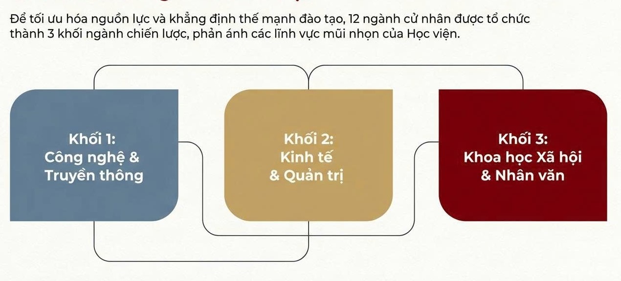 Theo dự kiến, Học viện tiếp tục duy trì và phát triển các ngành đào tạo nền tảng, đã khẳng định được uy tín và thương hiệu trong nhiều năm qua, đồng thời tổ chức đào tạo theo nhiều chương trình linh hoạt nhằm đáp ứng nhu cầu đa dạng của người học. Các lĩnh vực trọng tâm bao gồm nhóm ngành công nghệ – kinh tế – quản trị – luật – truyền thông – khoa học xã hội và tâm lý, phản ánh rõ thế mạnh liên ngành và định hướng ứng dụng của Học viện.