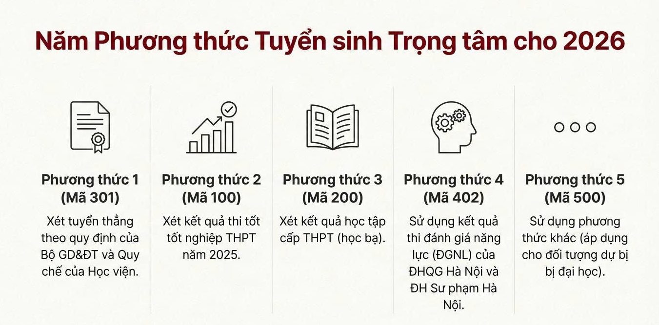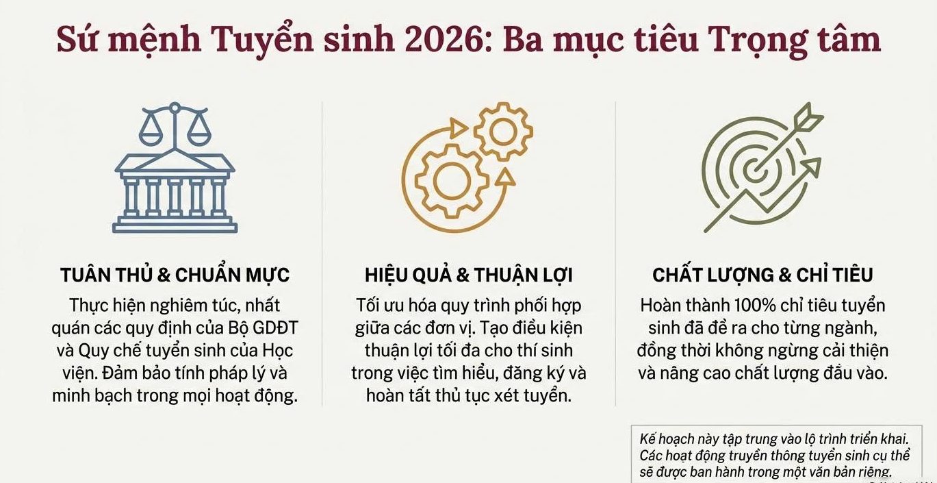 Song song với đó, kế hoạch tuyển sinh 2026 cũng thể hiện sự chuẩn bị kỹ lưỡng về tổ chức, truyền thông và tư vấn tuyển sinh. Học viện chú trọng cung cấp thông tin rõ ràng, dễ tiếp cận, giúp thí sinh và phụ huynh hiểu đúng – hiểu đủ về ngành học, chương trình đào tạo cũng như các chính sách hỗ trợ người học.