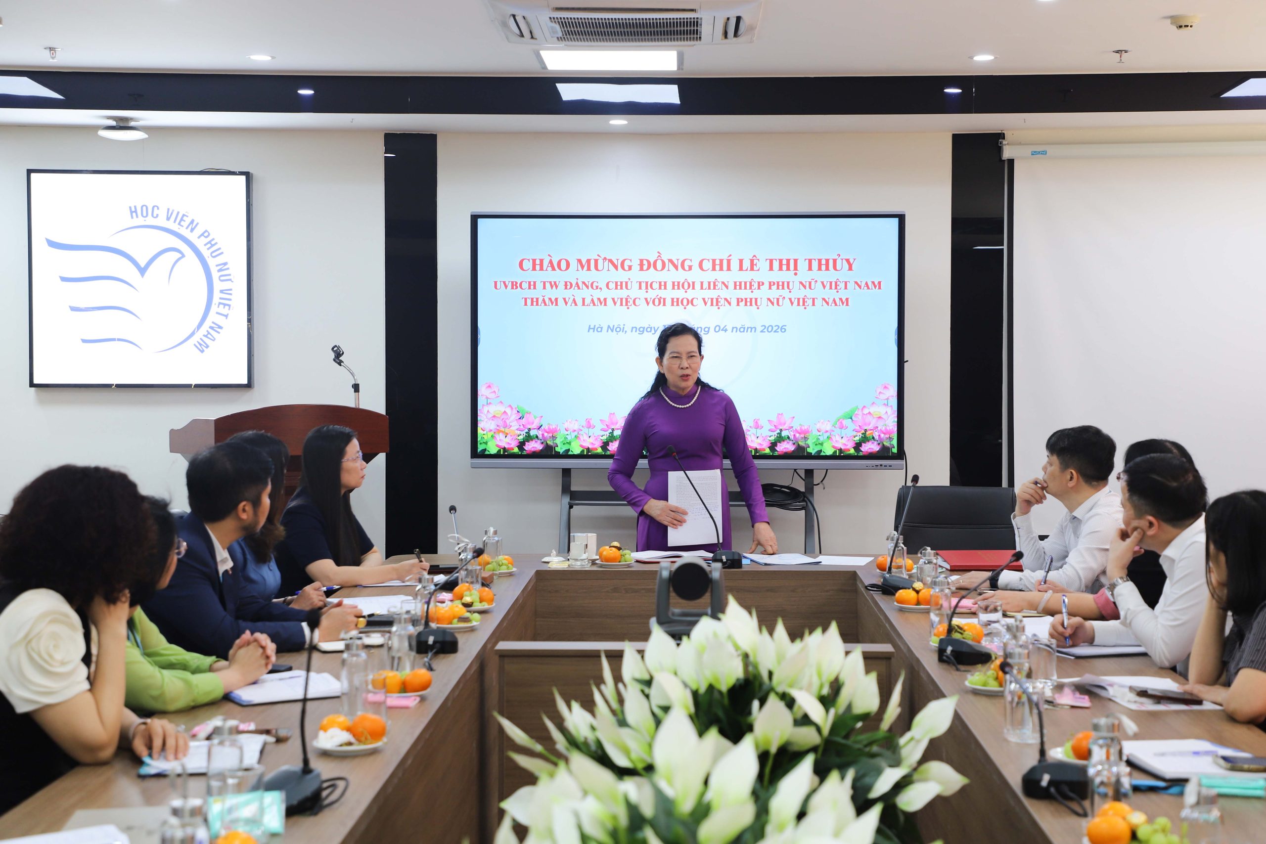 Phát biểu kết luận buổi làm việc, đồng chí Lê Thị Thủy ghi nhận và đánh giá cao sự phát triển toàn diện của Học viện Phụ nữ Việt Nam trong thời gian qua, từ quy mô đào tạo, chất lượng đội ngũ đến cơ sở vật chất và định hướng tự chủ. Đồng chí nhấn mạnh, trong bối cảnh mới, Học viện cần tiếp tục nâng cao vị thế, khẳng định vai trò trong hệ thống giáo dục đại học, đồng thời kiên trì giữ mô hình trực thuộc Hội Liên hiệp Phụ nữ Việt Nam. Các hoạt động của Học viện cần gắn chặt với nhiệm vụ chính trị của Hội, đặc biệt là các đột phá về nâng cao chất lượng nguồn nhân lực nữ.
