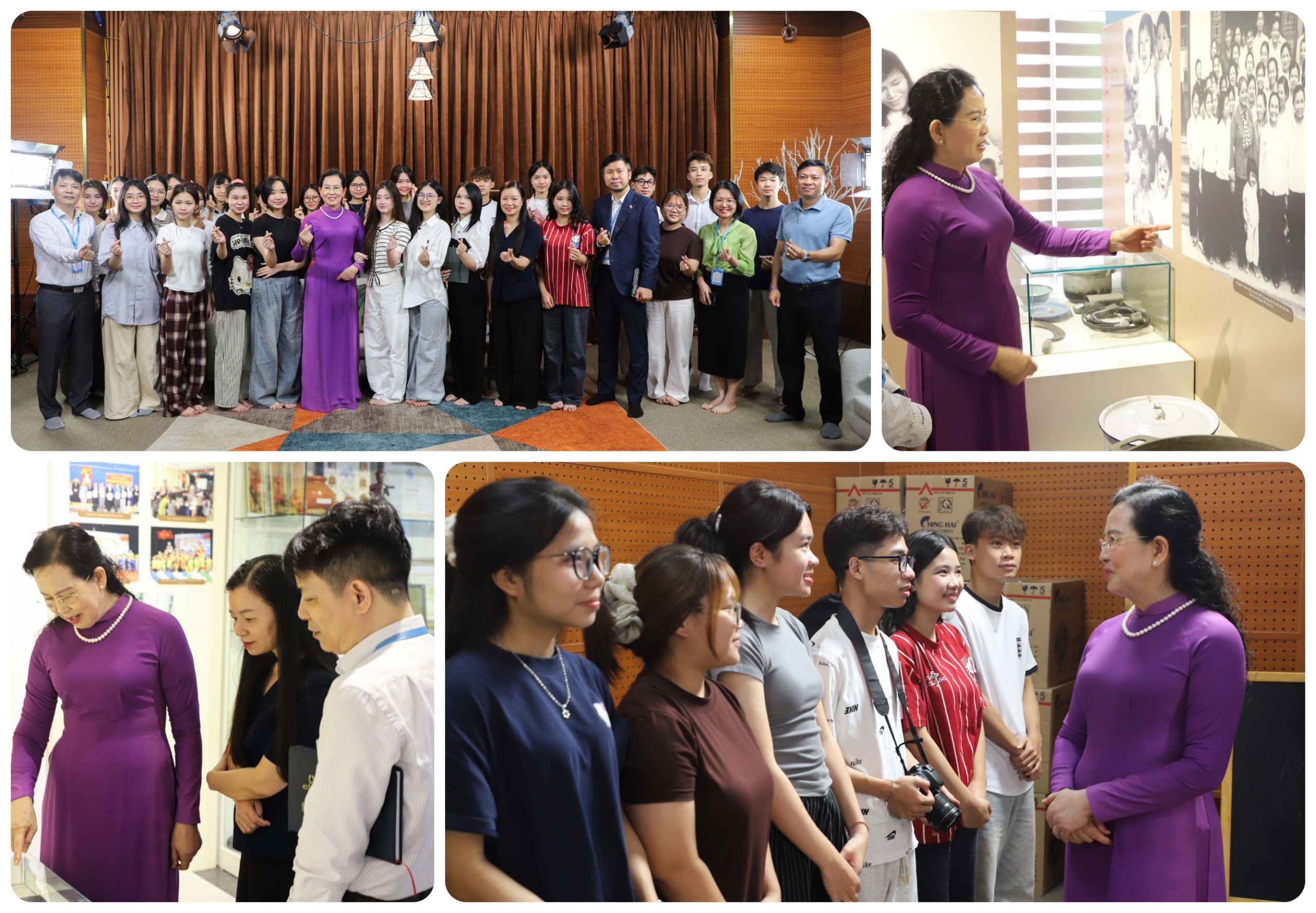 Đoàn công tác đã tham quan phòng truyền thống, nơi lưu giữ những dấu ấn quan trọng trong quá trình hình thành và phát triển của Học viện, qua đó thể hiện rõ vai trò, sứ mệnh của một cơ sở giáo dục đại học gắn bó chặt chẽ với sự nghiệp vì sự tiến bộ của phụ nữ và bình đẳng giới. Đoàn cũng trực tiếp dự giờ học thực hành của sinh viên tại phòng studio hiện đại, ghi nhận những nỗ lực đổi mới phương pháp giảng dạy, tăng cường ứng dụng công nghệ và gắn đào tạo với thực tiễn nghề nghiệp. Những hình ảnh sinh động từ lớp học đã phần nào phản ánh sự chuyển biến tích cực trong cách tiếp cận đào tạo, hướng tới nâng cao kỹ năng và năng lực thực hành cho người học.