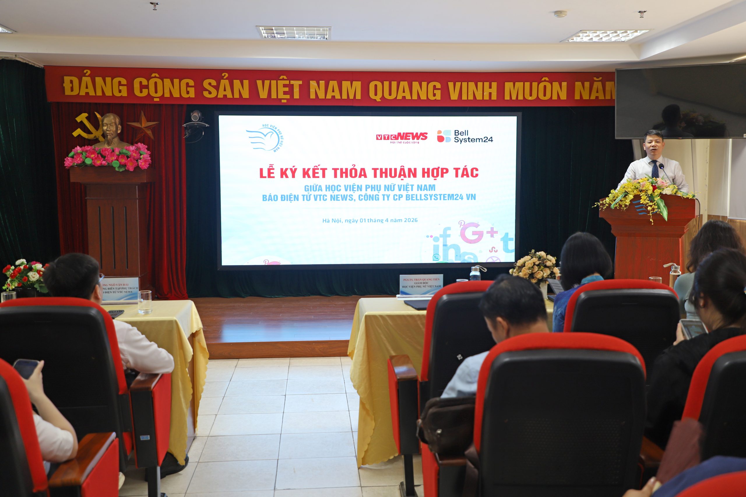 Nghi thức ký kết chính thức diễn ra trong sự chứng kiến của toàn thể đại biểu và sinh viên. Đại diện Học viện Phụ nữ Việt Nam và Báo điện tử VTC News đã thực hiện ký kết thỏa thuận hợp tác, đánh dấu sự khởi đầu cho mối quan hệ hợp tác lâu dài giữa hai đơn vị.