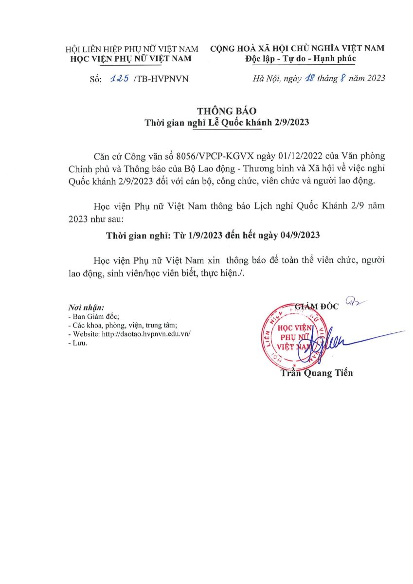 Học viện Phụ nữ Việt Nam thông báo lịch nghỉ Quốc khánh 2/9