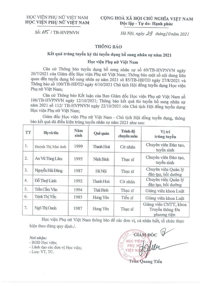 Kết quả trúng tuyển kỳ thi tuyển dụng nhân sự bổ sung năm 2021