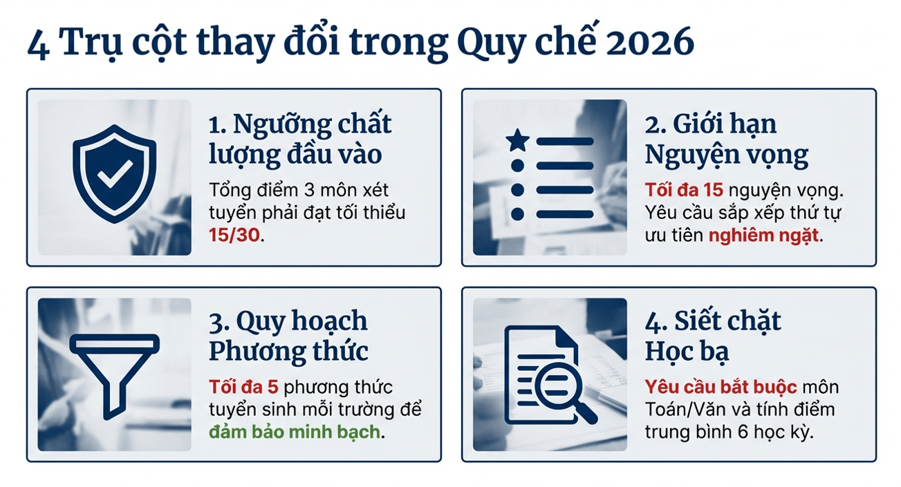 Nhìn chung, Quy chế tuyển sinh 2026 là sự tổng hòa giữa khả năng mở rộng cơ hội cho thí sinh và khống chế quy trình xét tuyển thật sự nghiêm túc, minh bạch và khách quan. Việc giới hạn số nguyện vọng, siết chặt xét tuyển học bạ và công khai phương thức giúp thí sinh lên kế hoạch đăng ký đúng đắn, tránh việc chỉ tập trung vào 1–2 trường hay phương thức duy nhất.