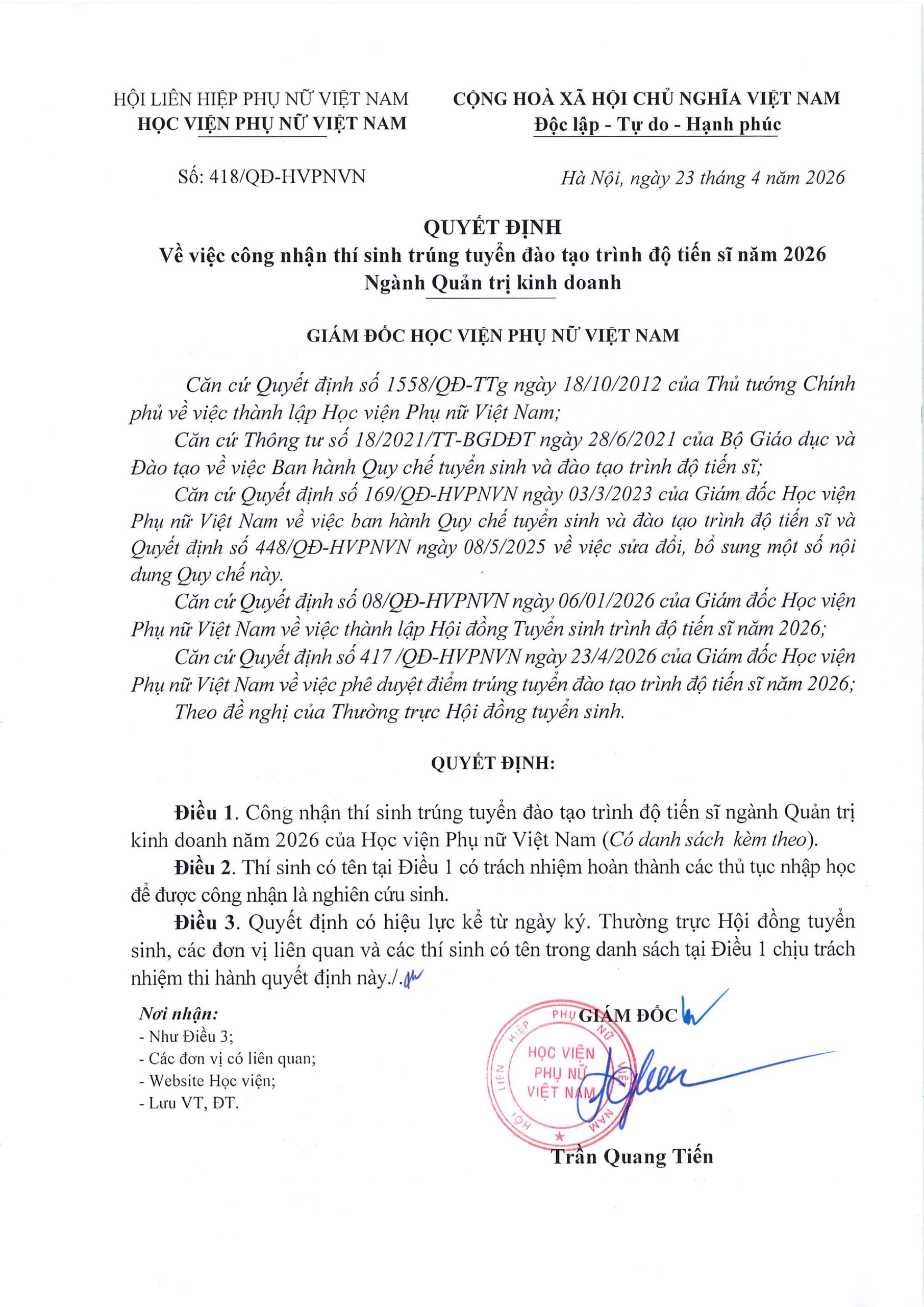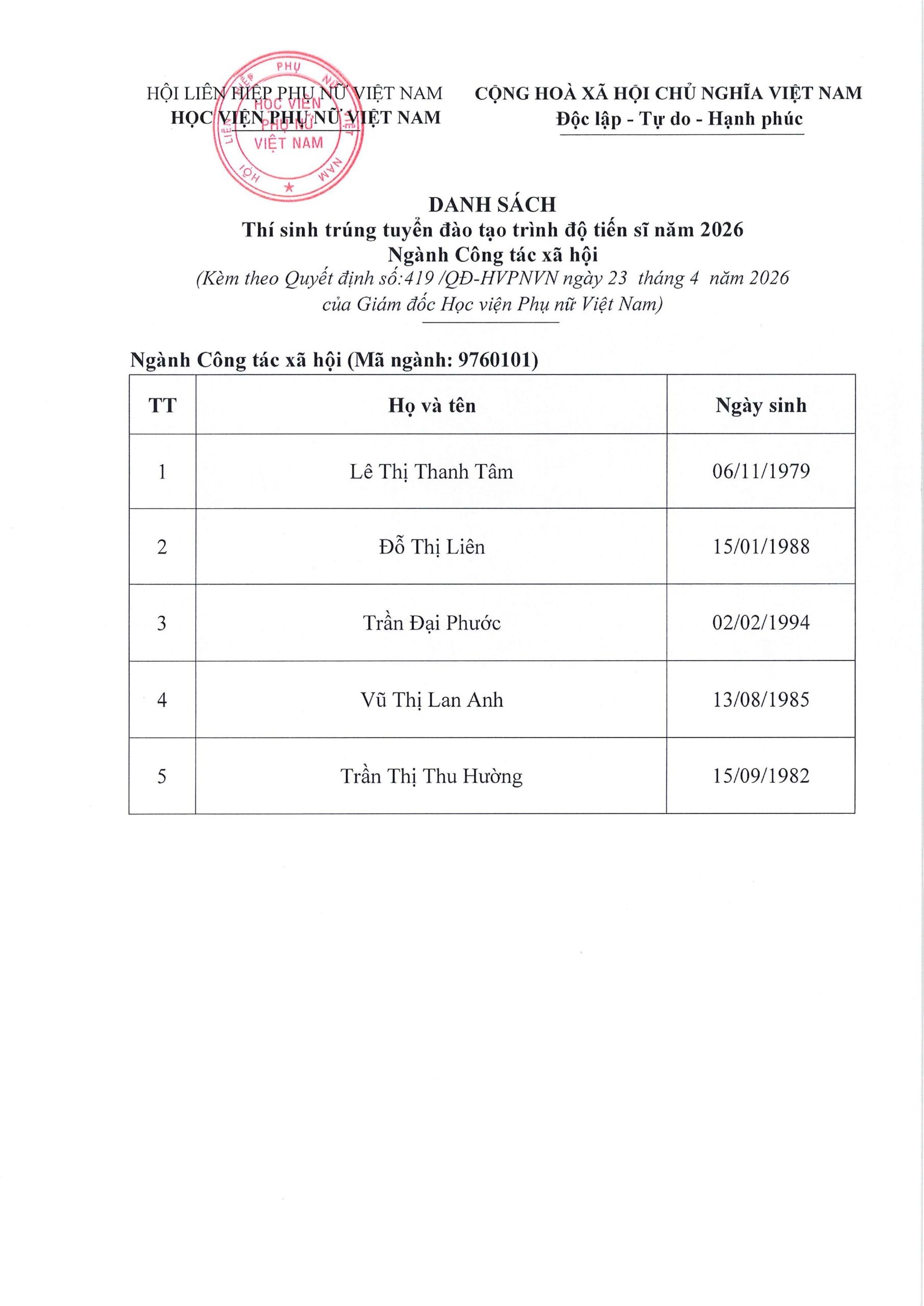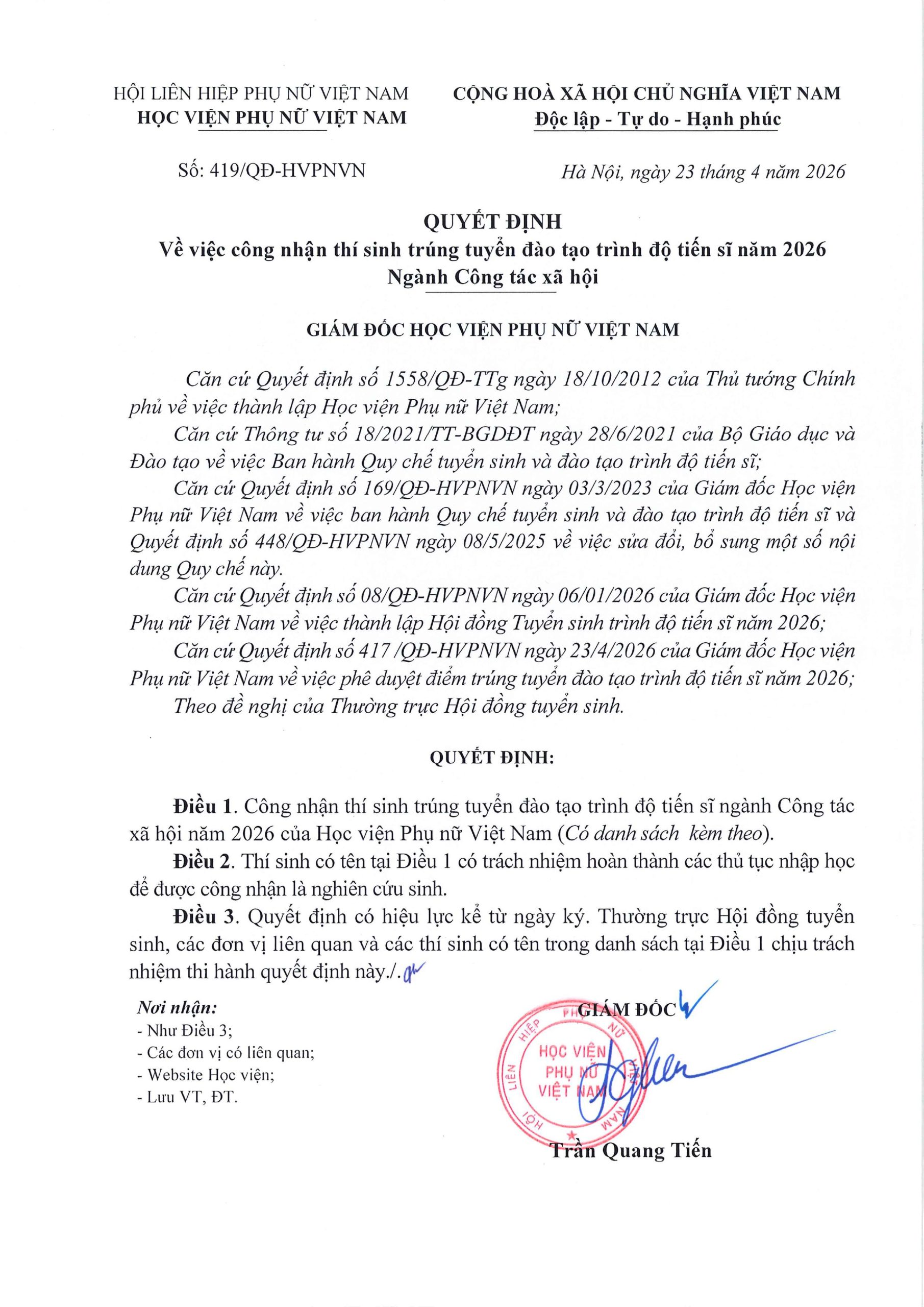 Học viện Phụ nữ Việt Nam công bố Quyết định công nhận thí sinh trúng tuyển đào tạo trình độ Tiến sĩ ngành CTXH và QTKD năm 2026.