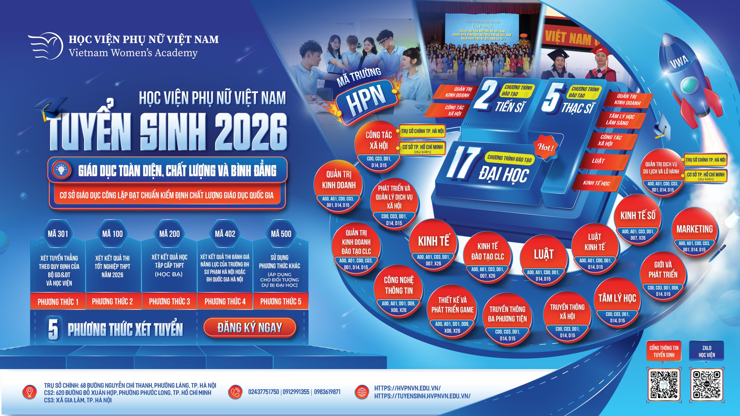 Năm 2026, Học viện Phụ nữ Việt Nam tuyển sinh 17 chương trình đào tạo: